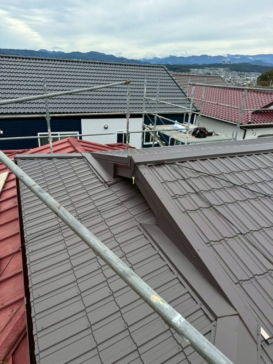 こんにちは、屋根リフォーム相談窓口です。 当ホームページをご覧いただきありがとうございます。 静岡県伊東市で化粧スレートの上に立平葺きで重ね葺き工事を行いました。 本日は静岡伊豆支