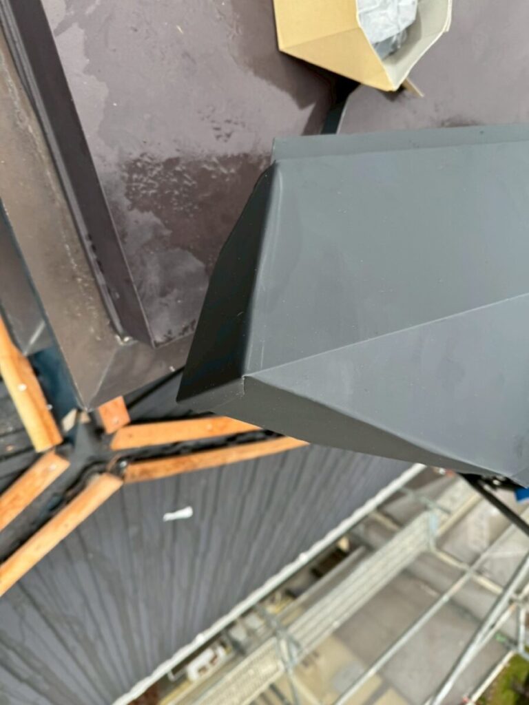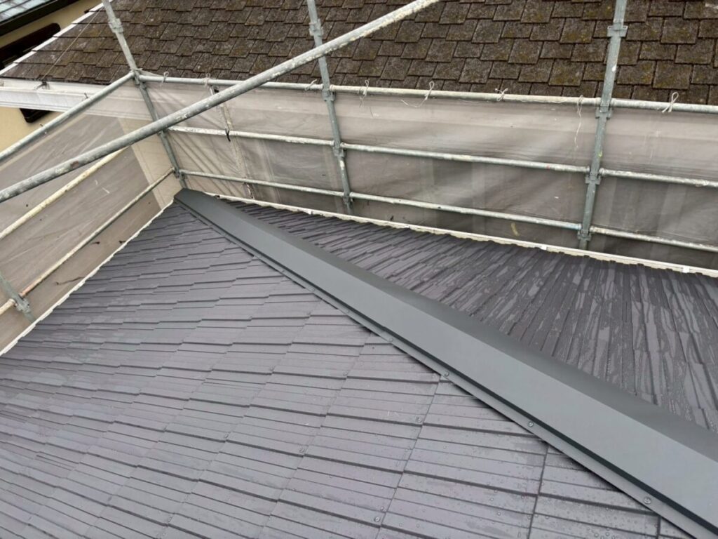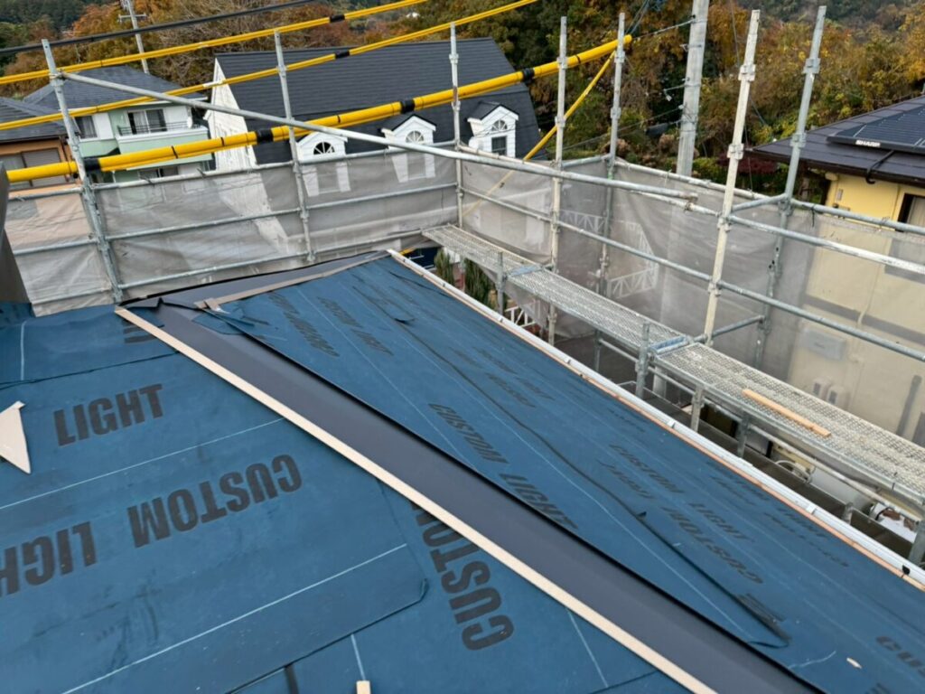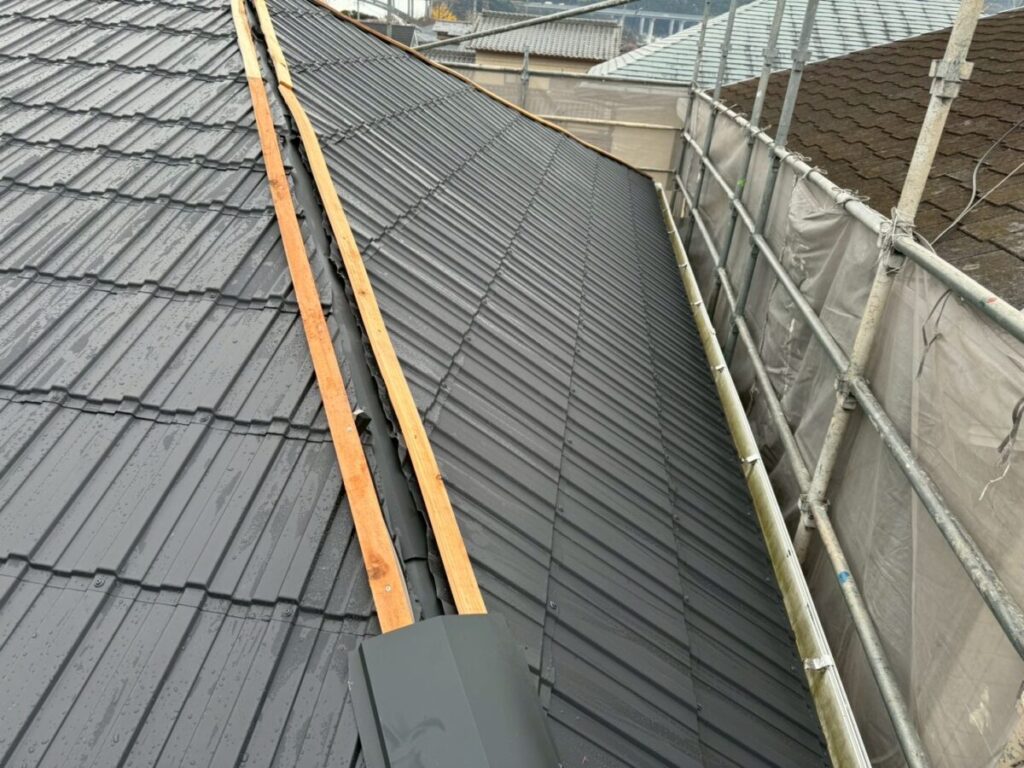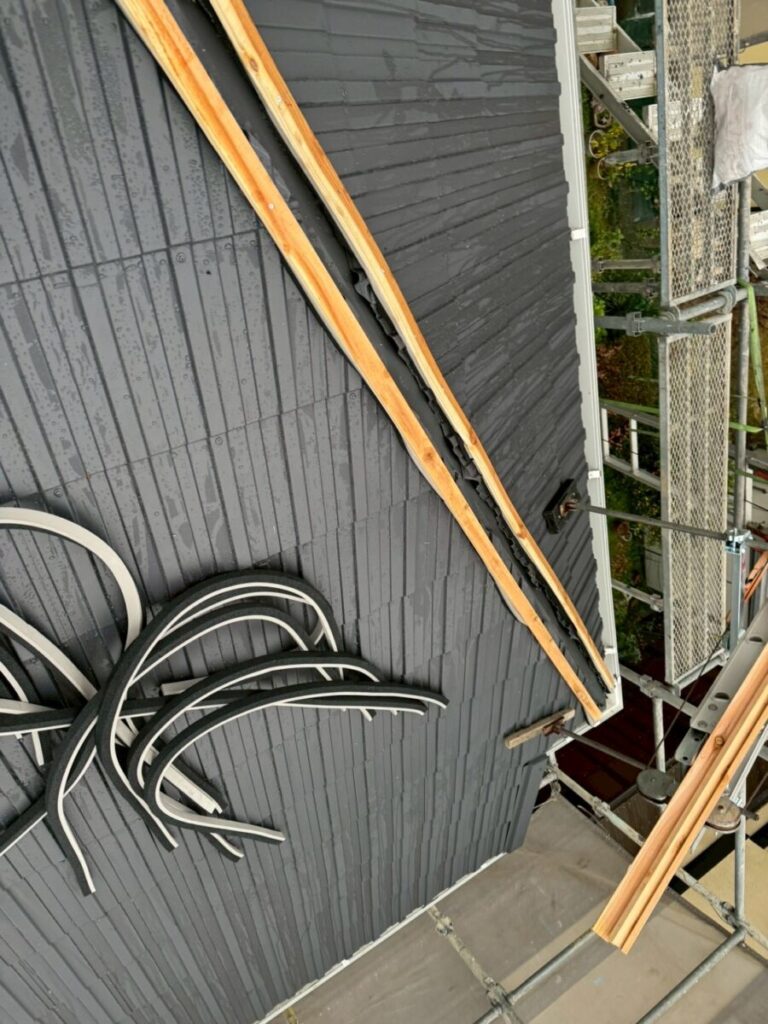 私のお勧め屋根レクトプルーフのご説明なんですが、板金屋根や化粧スレートなどの棟の下地が腐って強風で飛んでしまうなどの懸念点があるのですがレクトプルーフはとても安心です、そもそも縦方向に溝があるデザインなので雨水が横走りしないので降り棟の下敷き板金も私的には必要無いと思いますが標準仕様なので取り付けます、木下地は防水の為のケミカル面戸を押さえる為と棟の凹み防止の為だけに入れます、棟板金は屋根材に直接パッキン付きビスで絡める仕組みなので木下地が腐っても棟板金が外れる事は有りません、そもそもレクトプルーフは縦溝が深いので雨が降っても木下地は浮いている状態にあり水に接触し難いので腐る心配は極めて少ないです、この腐りを心配して人工木材を使用する業者もいますが人工木材は熱に弱く高温の屋根の上では劣化し易いので良く無いです、なので棟の収まり的にもベストな屋根材だと言えます。