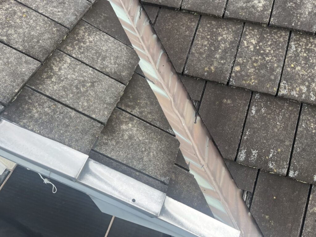 今回は雨漏りと言う事で伺いました、先ず室内を拝見したところ、部屋のクロスには雨染みがあり触っても濡れては居ないのですが昨晩雨が降ったのでサーモカメラで写したら雨染みの辺りの温度は下がってましたので多少の雨でも雨漏りしているようです、次は高所作業車で屋根上を見ましたが谷にも穴は確認出来ず屋根材も割れていません、築年数は40年程との事なので、この場合下地のルーフィングの劣化が原因かと思われます、屋根が破損していれば直して様子を見る事が出来ますが下地ルーフィングが壊れてしまうと簡単には直す事が出来ません、コンクリート瓦なのでカバー工法も出来ませんので、葺き替え工事一択になってしまいます、部分的に直す事も出来ますが同じ屋根材は販売されていませんので、違う屋根材になってしまうし1箇所この様な状態になると違う箇所も同じ条件なので部分的に直しても次々と雨漏りが始まるので、どうしても全葺き替えが1番安く済む方法となってしまいます。