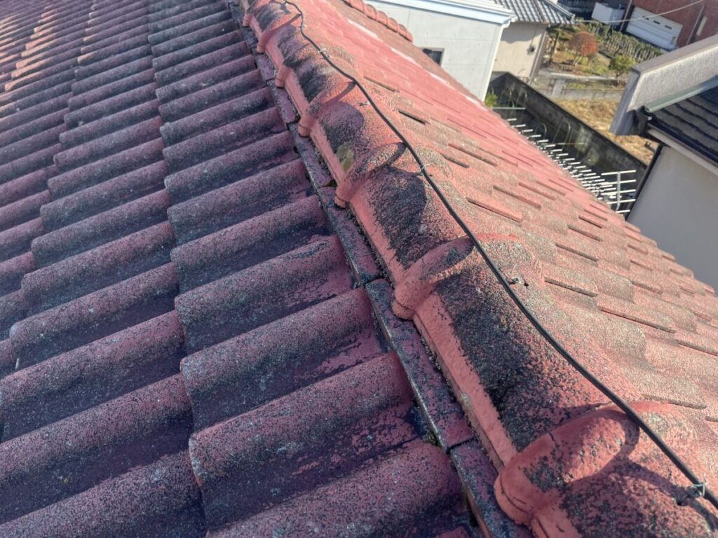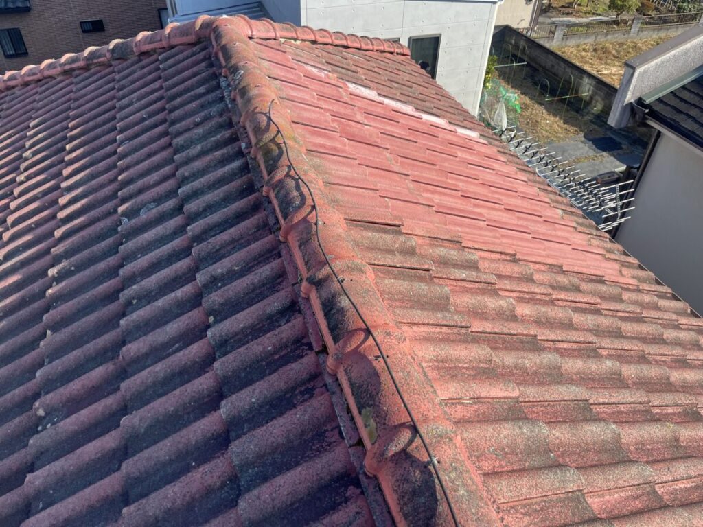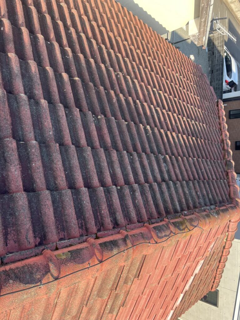 セメント瓦の現場調査に伺いました、前からお付き合いのある業者様との相見積もりという事で前業者さんが天井裏にあがり雨漏りがある事から葺き替えの見積もりとなったので私共も葺き替えの見積もりを作成致します、セメント瓦は雨漏りしていた場合は瓦が割れての雨漏りならば割れた瓦をコーキングすれば直りますが画像の様に一枚も割れて無いので下地のルーフィングの寿命となりますがルーフィングを替えるには瓦を全部外す必要があり、外した瓦をまた戻すにも割れた場合には発売終了商品なので替えが無く厄介なので、必然的に違う屋根材への葺き替えとなります、勿論屋根カバー工事も出来ません、塗装も割れる可能性もあり絶対に勧められませんが、そもそも雨漏りしてますので屋根替えしか無いです。