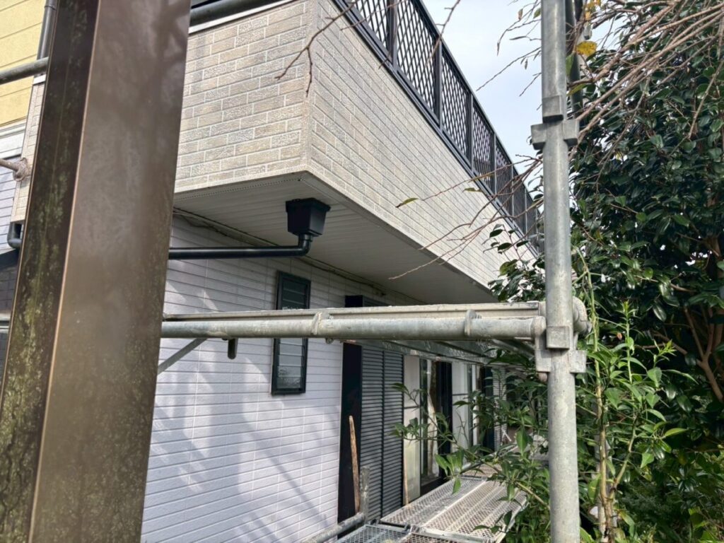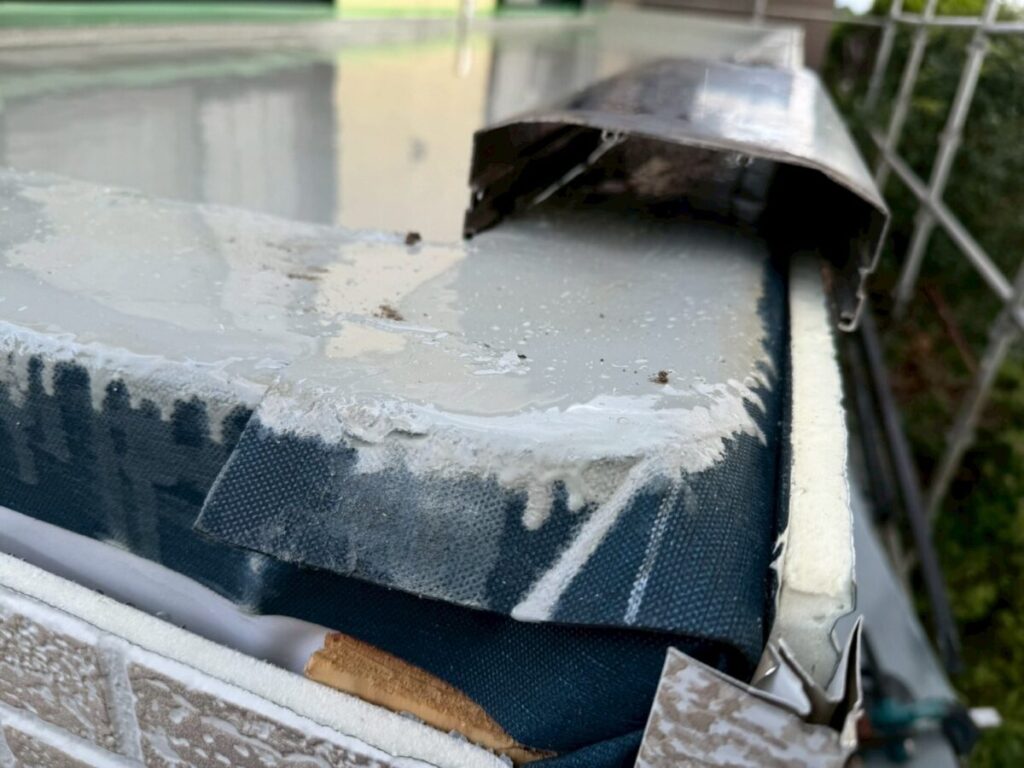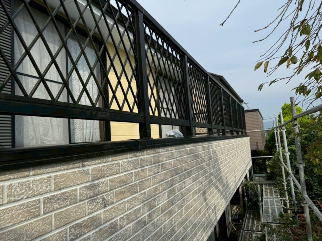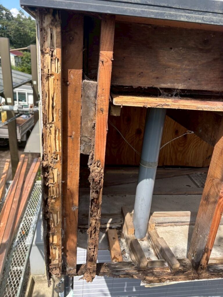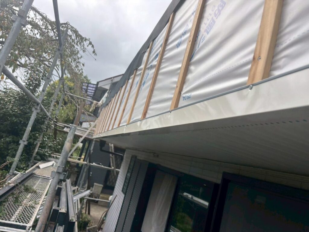 今回の雨漏りはバルコニーの下にある部屋への雨漏りと言う事で直接の原因はバルコニーの笠木から壁への雨漏りでバルコニー床面は関係ないのですが、お施主様のご要望で床の防水も一緒にやり変えたいとの事でセットでやり変えとなりました、バルコニーの雨漏りで1番多いのアルミ笠木のジョイント等から入った雨水なので天板の防水は特に念入りに粘着層ルーフィングを貼り床面の防水層も粘着層付きルーフィングに被せて貰い水の侵入を防ぎます、よく塗装工事の時にバルコニーの床面に塗装屋さんがトップコートと言う塗料を塗装して、お客様は防水をやり直したと勘違いされている場合が多くありますが、あくまでもトップコートは見た目だけで防水にはなっていません、今回の工事もタッグシートと言うシートを貼ってシッカリと防水しその上にウレタンを厚く塗る作業をしています、完全に密着させると伸び縮みにより不具合が発生するので空気層を作り脱気する仕組みになっています、壁面の腐った木材もしっかりと補強して元気に生まれ変わりました!