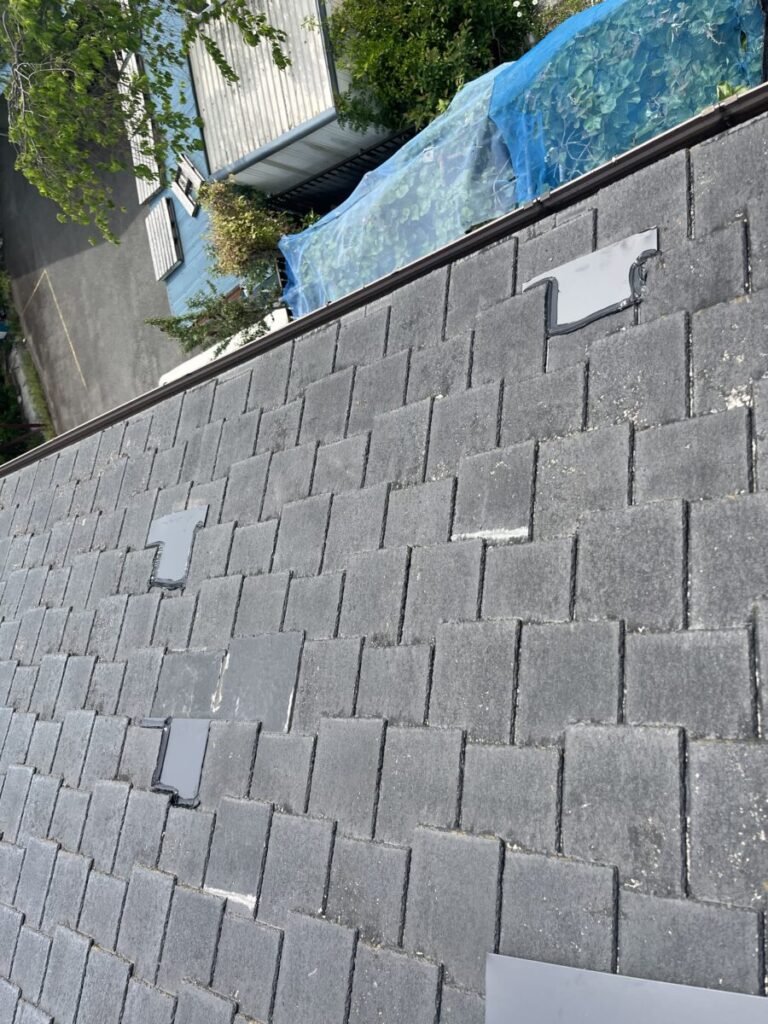 今回は化粧スレート屋根のアーバニーの補修工事です、このアーバニーと言う商品は鱗状のデザインが通常の化粧スレートと違い高級感があり化粧スレートの上位モデルとして一時人気の商品でした、デザイン的に縦スリットとの多い商品なので割れ難いように一般の化粧スレートよりも厚く作られています、アスベストが含まれているアーバニーは現在でも割れは少ないのですが、ノンアスになってからは割れが多く発売も中止となりました、今回のアーバニーも割れの多さからノンアスと見られます、お施主様からは今までに何回も補修してきたけど結局取れるので見た目は気にしないから水が入り難い様にして下さいと言う御依頼で板金を差し込む事となりました。見た目は良く無いのですがコレが1番安心で安全です。