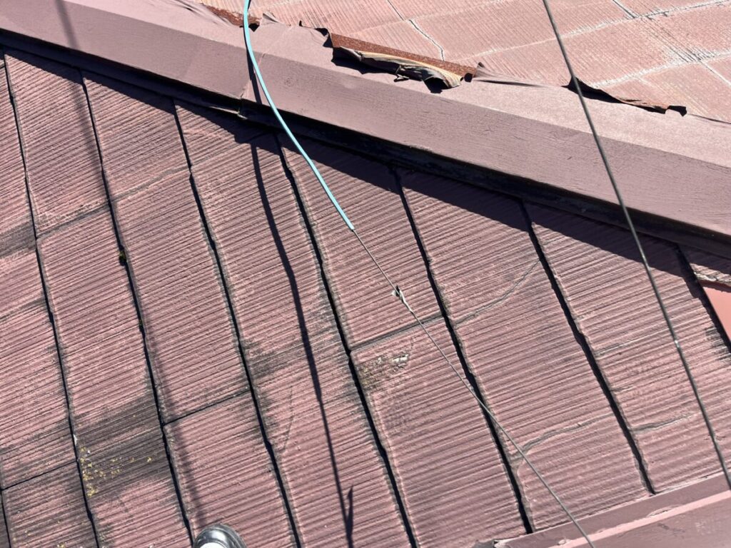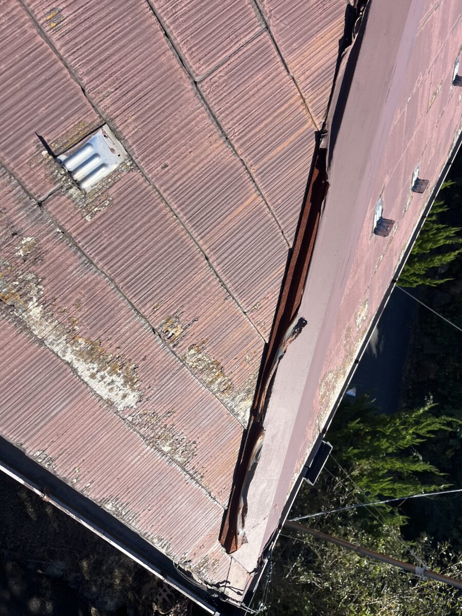 コチラの金属の棟の部分が皮が捲れた感じでビラビラしているので気になるとのご指摘で現場調査に伺いました、この鋼板は塩ビ鋼板と言ってスチール(鉄)に塩ビで表面をコーティングした鋼板で30年位前迄は結構出回っていました、今は板金を扱う建材店でも取扱いは無い商品です、コチラは通常は中のスチールが錆びててボロボロになってしまうのですが今回は逆で中は錆びてはいるものの腐っては無く塩ビだけが捲れています、コレは前回の塗装業者が塩ビ鋼板用の下塗り材を使用していなかった事が原因かと思われます、一般的には30年程前の物件の方は注意が必要ですが、大手ハウスメーカーでは私が現場調査を行った現場で20年位前のものでも屋根や部材に使われていましたので、大手ハウスメーカーのオリジナル商品は最近でも使用されていてもおかしくないので、塗装の際には業者さんにしっかりと確認を行って貰う事を呼び掛ける事は大事です。
