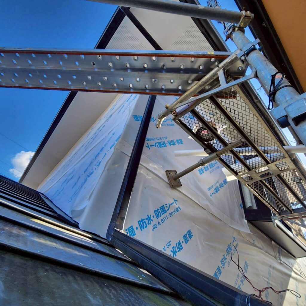 現在進行中の外壁金額サイディングカバー工事の下地工事です、白いのが透湿防水シートです、この金属サイディングカバーでの下地に透湿防水シートを貼る貼らない問題は賛否両論ありまして、貼る事のデメリットとしては予算が上がる事しか無いのですが全国的にシートが貼られる割合は5割程度だそうです、私共は必ずシートを貼る事を推奨し、窓廻りなどもブチルテープで防水しますのでシート無しは考えられません、胴縁は木材、コレも最近は木材では無く人工木材が流行っていますが私共は人工木材はビスの効きも良く無かったり耐久性に疑問があるので使用いたしません、下地が終わればリクシルのフッ素塗装の金属サイディングを施工していきます。