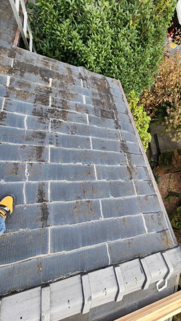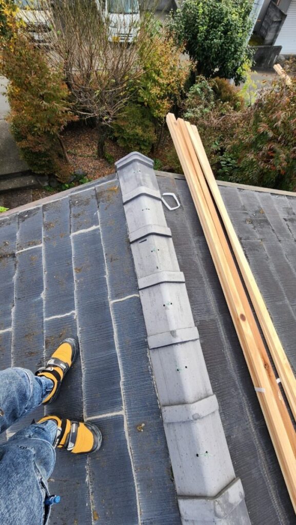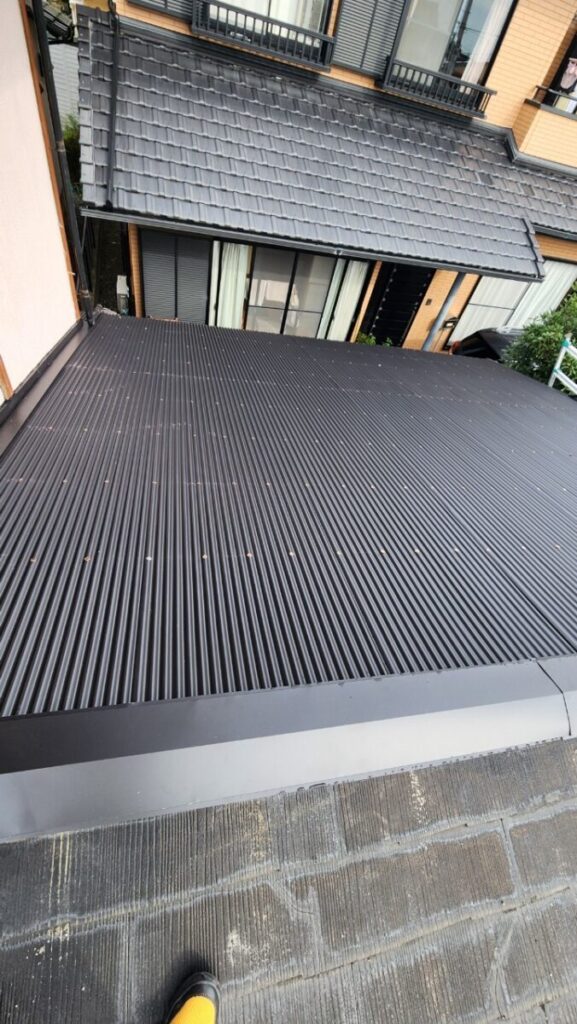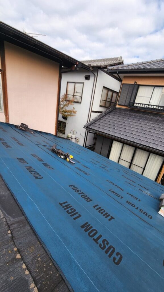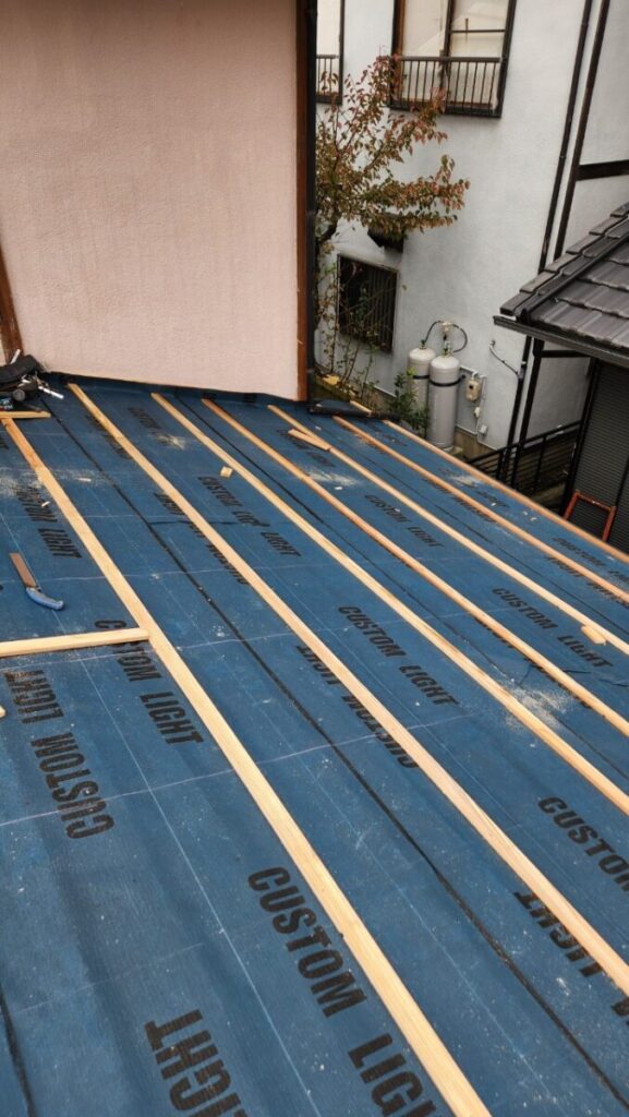 コチラは化粧スレート屋根の雨漏りの現場です、以前他社さんに見てもらったら止水の為にコーキングをしてくれたそうですが治らなかったそうです、みたら重なり部分に全部コーキングしてました、そもそもコーキングで治る物では無いのですが百歩譲ってコーキングするにしてもたての継手はコーキングをしても支障は無いのですが横にやったら、よけいに悪くなります、建物的には長くは済まないので取り敢えず確実に雨漏りが止まって予算が掛からない方法でとのご依頼があり今回の施工方法をご提案しました、ガルバリウムの波板です、粘着層付きルーフィングを貼り下地の横胴縁を打ちますが、コレ重要です!雨漏りで野地板も緩いので野地板の垂木を狙ってしっかりと留めてそこに対して波板を留めつけていきます、この方法は見た目的な事や雨樋に水が入りにくくなる等の事から一般的にはあまり普及してませんが、今回の様なケースにはピッタリだと思います。