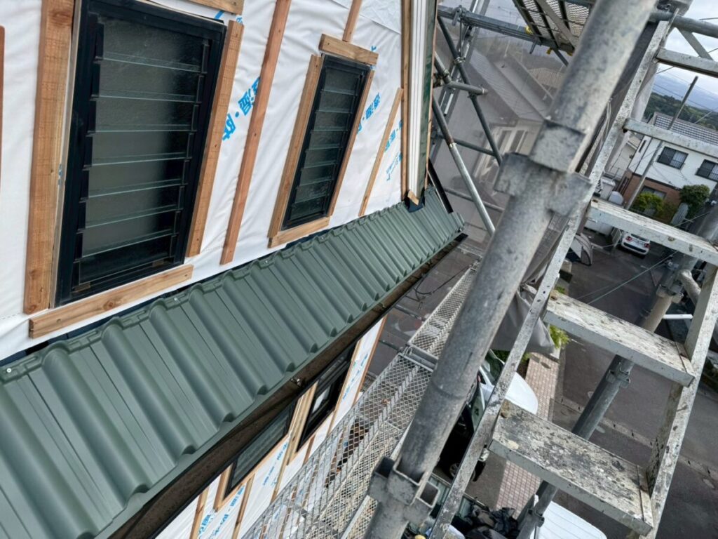 このような屋根は見た目がおしゃれな一方で、雨水の処理をしっかり考えながら施工しなければなりません。そのため、初日の段階から細かい納まりを一つずつ丁寧に確認しながら作業を進めております。