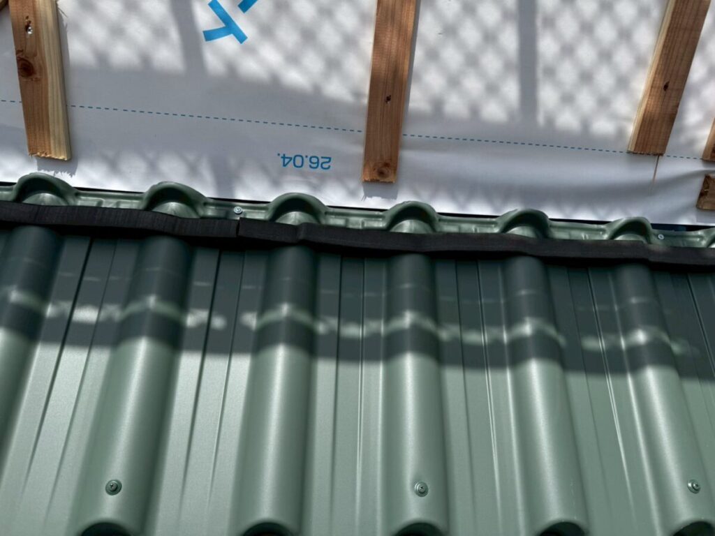 そしてマックスハイプルーフの大きな特徴として、板金役物を木材に直接釘やビスで留めないという点があります。一般的には木材に固定することが多いのですが、この屋根材は屋根材本体に直接絡めるように役物を納めていきます。