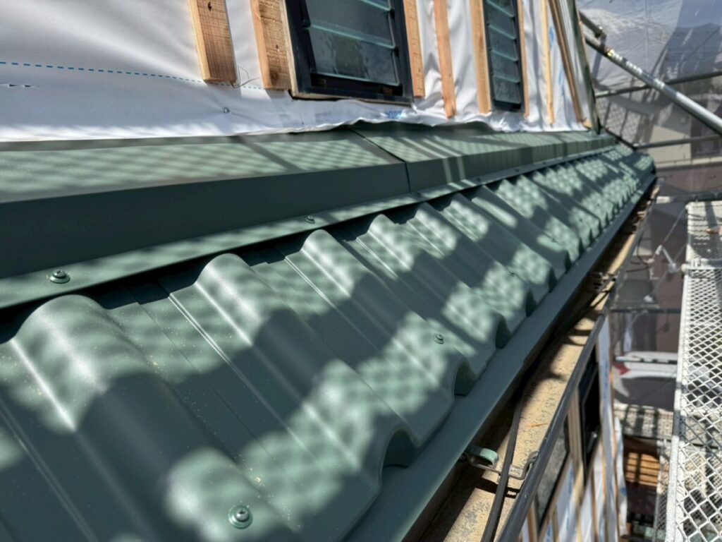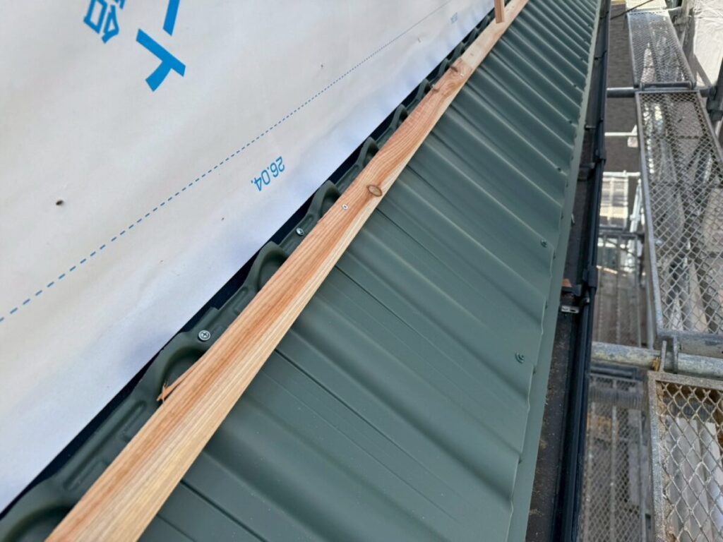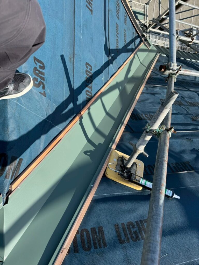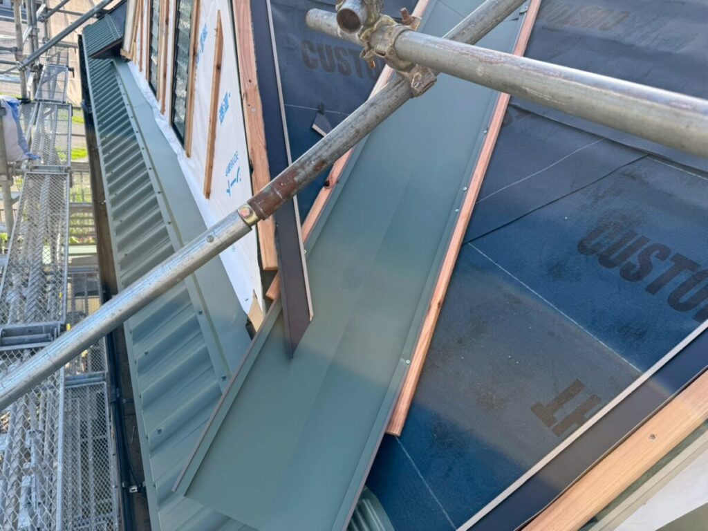 また、この日は谷部分の施工も行っております。特に重要なのが、ケラバの捨て谷の最後の部分を谷の上にしっかり乗せて納めていることです。これはケラバ側に流れ込んだ水を適切に谷へ導くための下準備であり、雨水の侵入を防ぐための大切な工夫です。
