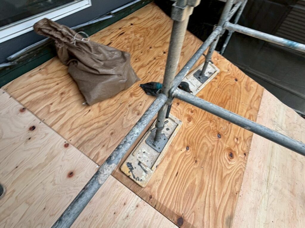 新しい横桟を設置し、その上にラーチ合板を施工することで、強く安定した屋根下地を作っていきます。