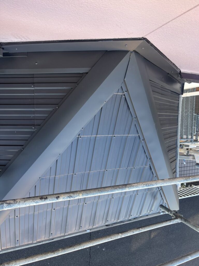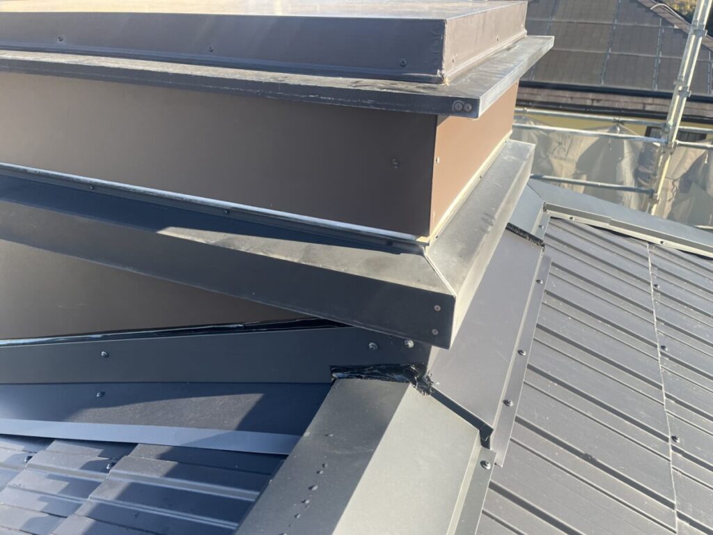 本日は昨日完工しましたレクトプルーフの完了確認に行ってきました、全体的な凹みやビスの打ち忘れのチェックは勿論ですが私が1番気にして見ているのは壁際部分の収まりです、今回の現場で言うならば玄関ポーチの壁際部分と大屋根の飾り煙突廻りです、この部分が職人の腕の見せ所ではありますが、逆に言うとココがダメだと全てが台無しになる感じがあります、雨仕舞いの面も大きいのですが、壁際の雨押さえの立ち上げは地面からも見え易いので見た目を美しく収める事もかなり重要な場所になります、専用の部材を勿論使うのですが、それだけでは不安な事もあり必ず板金平板のコイルも同時に購入し現場によりカバーなどを作成して綺麗に収まる努力をしています、今回も問題無く収まっていましたので安心しました。