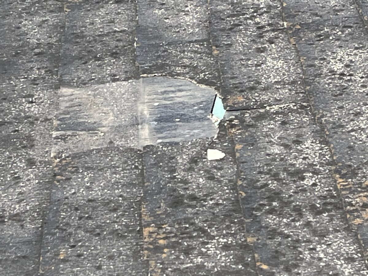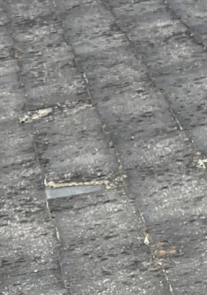 本日のお客様はご自分で下から見て屋根材が一枚ズレているので直して欲しいと言う事で伺いました、築年数は20年程前との事です、さっそく高所作業車で見てみると一枚ズレていました、強風で飛ばされる可能性が高いので取り除きましたが下地のルーフィングが剥き出しになっています、この様な場合一枚だけでも取り替える事は可能なのですが、たまたまズレたのが一枚だけで違う屋根材も大分割れたり欠けたりしてましたので取り替えの際に違う屋根材が破損する可能性が大きい事と屋根材の表面が劣化してザラザラしてるので滑り易く作業には足場が必要になる事を考えるとカバー工法がお得ですとお伝えしました、初めはお客様も半信半疑でしたのでご一緒に作業者で見てみますか?とお伝えし実際に肉眼で見たらすぐに御納得していただけました、実際に上の画像よりも肉眼でみるとダメなのがハッキリと分かります、私はドローンを使わないのですが理由はそこにあります。