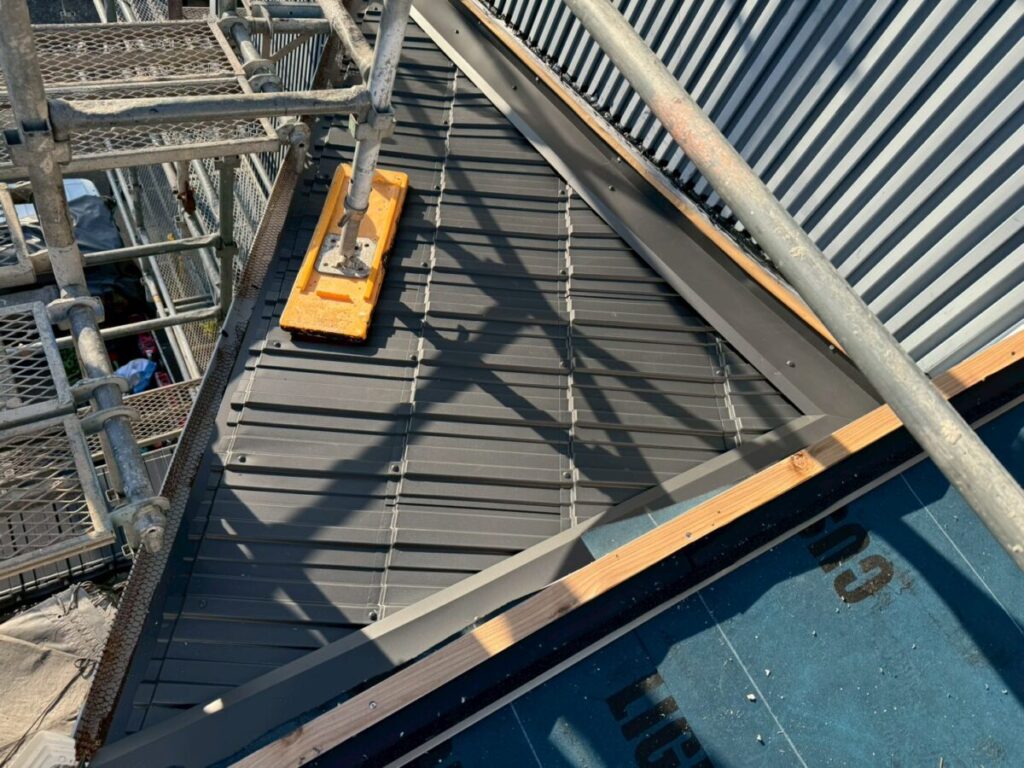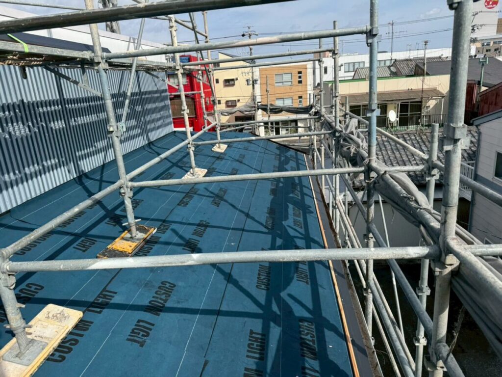 さらに、防水の要となる下葺き材には粘着層ルーフィングを施工し、二重の防水構造としています。