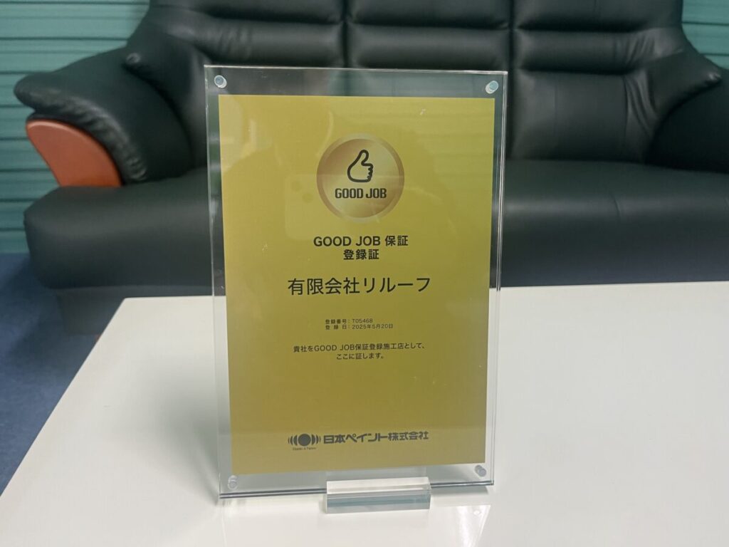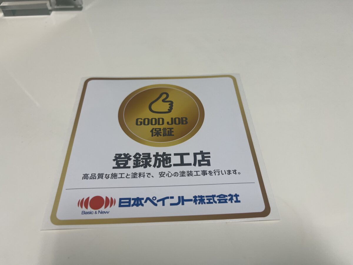 先日いつも使用している塗料のメーカー、日本ペイントさんから新しい塗料の保証システムが出来たので加盟しませんかとのお話しがあり、加盟しましたら日本ペイント静岡営業所の所長さんが盾とステッカーを持ってきて下さいました、とてもカッコいいです。どの様なシステムかと言うと塗料を発注するのに日本ペイントのアプリを通して発注します、その時に物件の情報として塗り面積を記入するので確実に物件に対して必要な量の塗料が発注されたか分かりますので、その上で塗料に不具合が起きた場合は日本ペイントで責任を取りますよと言うシステムです、一見すると使う量を発注するのは当たり前では?となると思います、でも古い塗料と混ぜたり、中塗りを変えたり、薄めて伸ばしたりは行われて居ますので、このシステムは絶対に大事でお勧めです!
