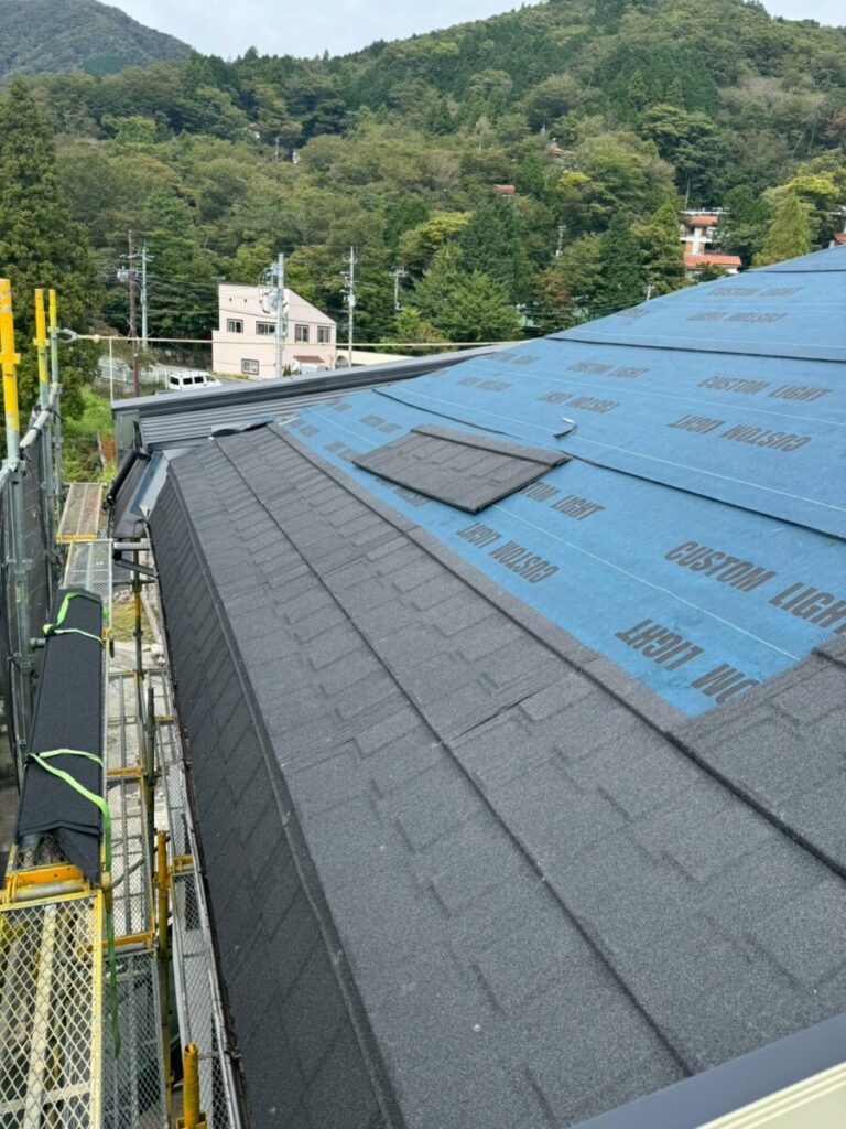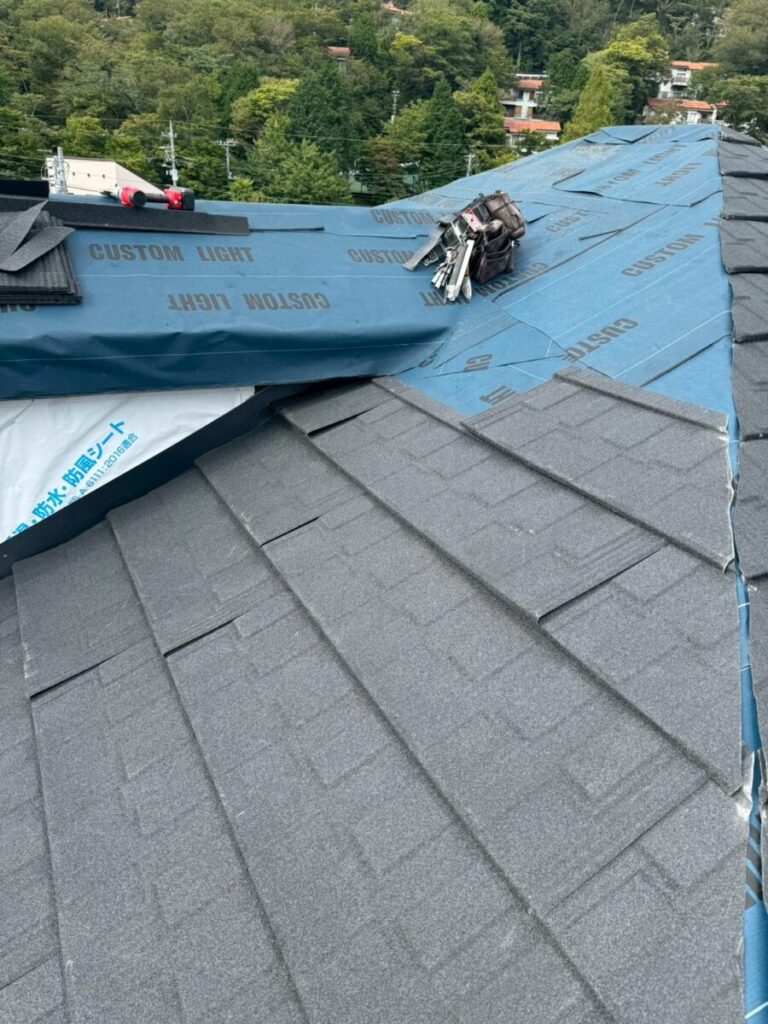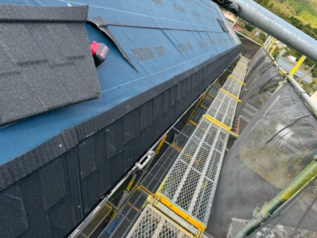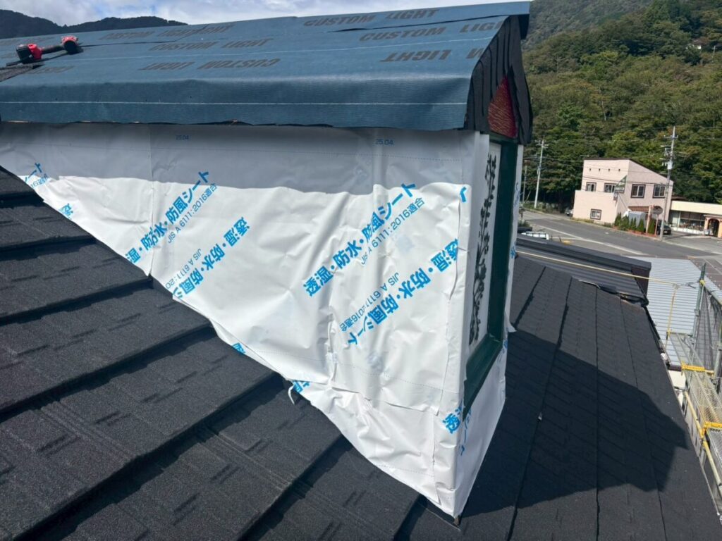 現在進行中の現場となります、屋根材はリクシルのTルーフモダンです、雨漏りがあった現場ですので合板を貼りルーフィングは粘着層付きルーフィングを使用しています、軒先が特殊なデザインで角度が変わっていますが石付きの役物を上手く使い収めています、少し大きめのドーマーが2箇所ありまして、コチラも大部分を屋根材で囲って行きます、元々がアスファルシングル葺きなので今回の屋根も同様に小さな石粒をまぶしてあるのは同じなので見た目は近いものがあるのですが、シングル葺きはアスファルトルーフィングに近い素材に石粒をまぶしているのに対して今回のTルーフの様な石付き屋根は金属屋根に石粒をまぶしているので根本の持ちが違いますので、絶対的にお勧めです。