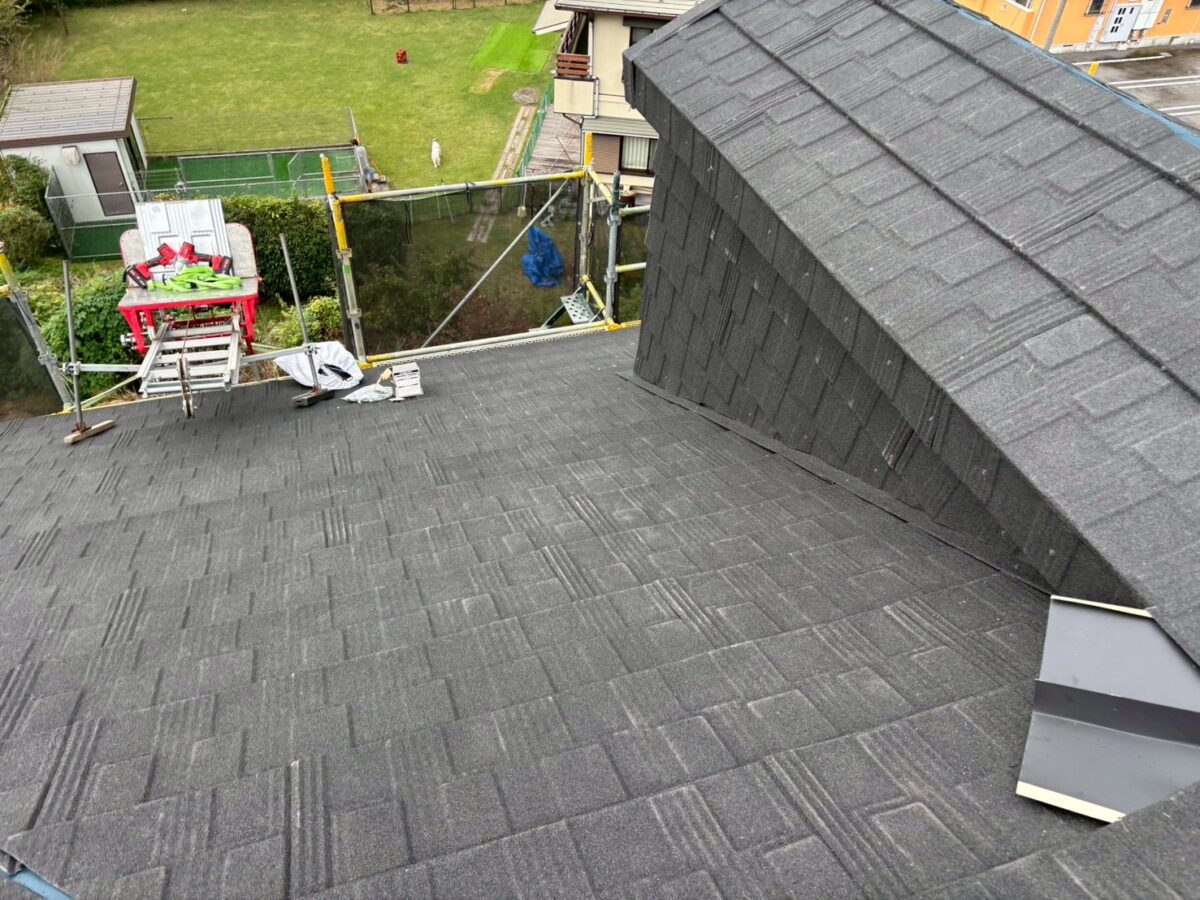 現在進行中の現場となります、屋根材はリクシルのTルーフモダンです、雨漏りがあった現場ですので合板を貼りルーフィングは粘着層付きルーフィングを使用しています、軒先が特殊なデザインで角度が変わっていますが石付きの役物を上手く使い収めています、少し大きめのドーマーが2箇所ありまして、コチラも大部分を屋根材で囲って行きます、元々がアスファルシングル葺きなので今回の屋根も同様に小さな石粒をまぶしてあるのは同じなので見た目は近いものがあるのですが、シングル葺きはアスファルトルーフィングに近い素材に石粒をまぶしているのに対して今回のTルーフの様な石付き屋根は金属屋根に石粒をまぶしているので根本の持ちが違いますので、絶対的にお勧めです。