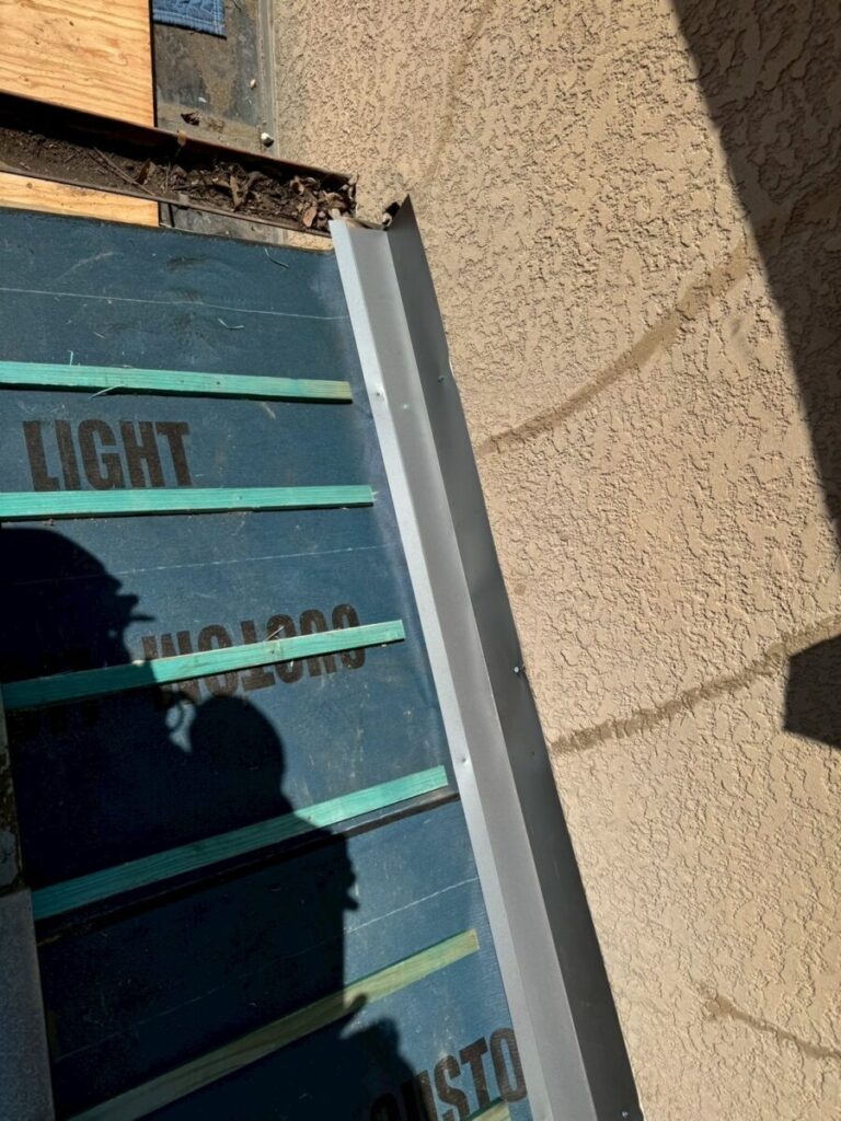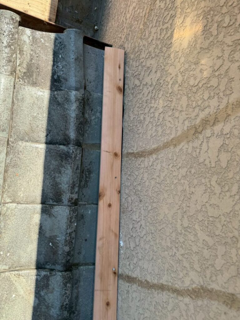 今回は瓦屋根の雨漏りの現場となります、増築した部分の壁際からの雨漏りなのですが、原因は屋根が互い違いになっている小さな谷部分にありまして、この水が壁際の捨て谷を通り軒先迄流れる仕組みとなっていますが壁際に雨押さえが付いて無かった為に枯葉が入り込み水が内部で溢れる現象が考えられた為、下地のルーフィングから粘着層付きルーフィングに替え瓦桟も水が流れる様に切り欠いた物を打ちオーバーフローに備えます、捨て谷と谷も新しく取り替え壁際には枯葉が入らない様に雨押さえを取り付けました、本来ならばこの雨漏りし易い仕組みごと変えたいのですが、それには大きな費用が掛かってしまうので今回は現状を維持したままでの最善の方法での施工を行いました。