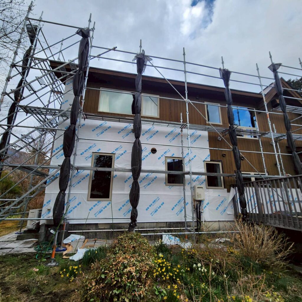 神奈川県仙石原で、外壁の金属サイディングカバー工事を行いました。今回はその初日の様子です。