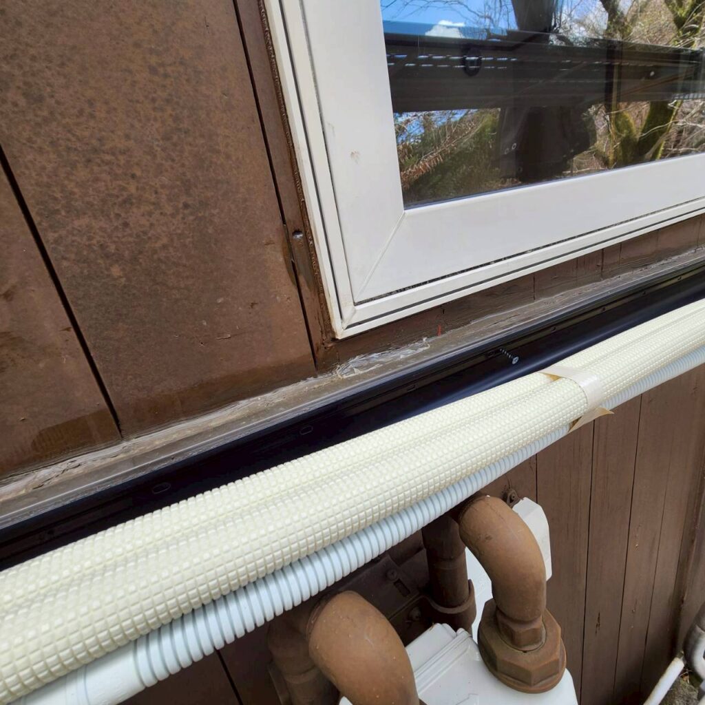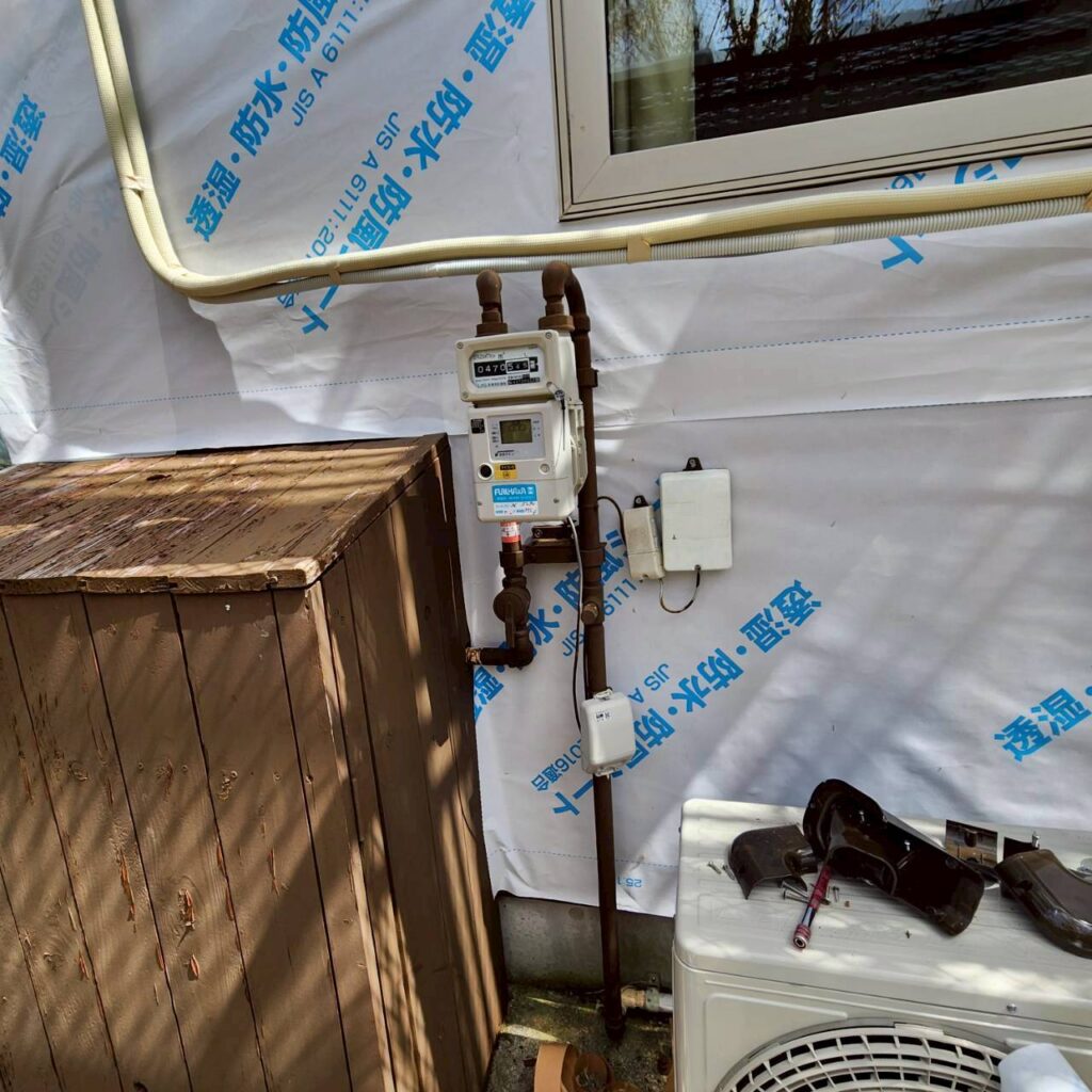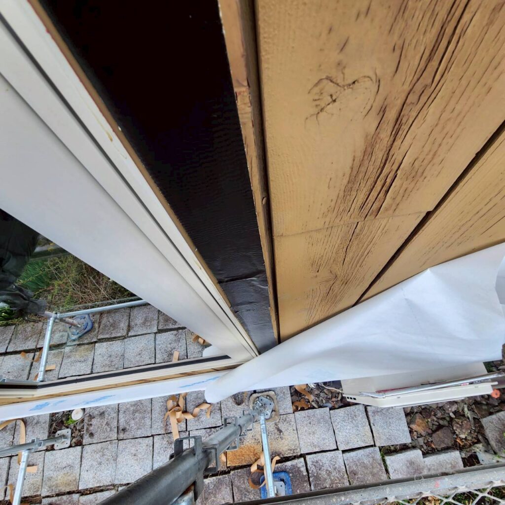 既存の外壁は、珍しい木材系の外壁でした。そのため、透湿防水シート自体は張りやすい下地ではありましたが、こうした工事で本当に大切なのは、ただ張ることではなく、どこをどう納めるかという点です。