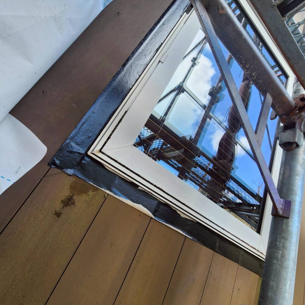 特にサッシなどの開口部まわりは、雨水の侵入リスクが高い部分です。そこで私たちは、防水テープをしっかりと施工し、水が内部へ回らないよう注意深く納めていきます。