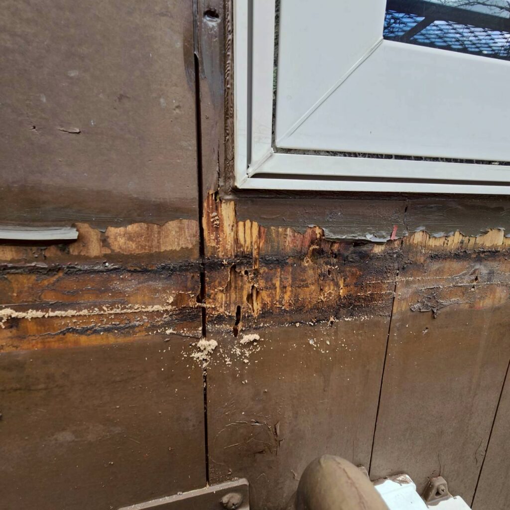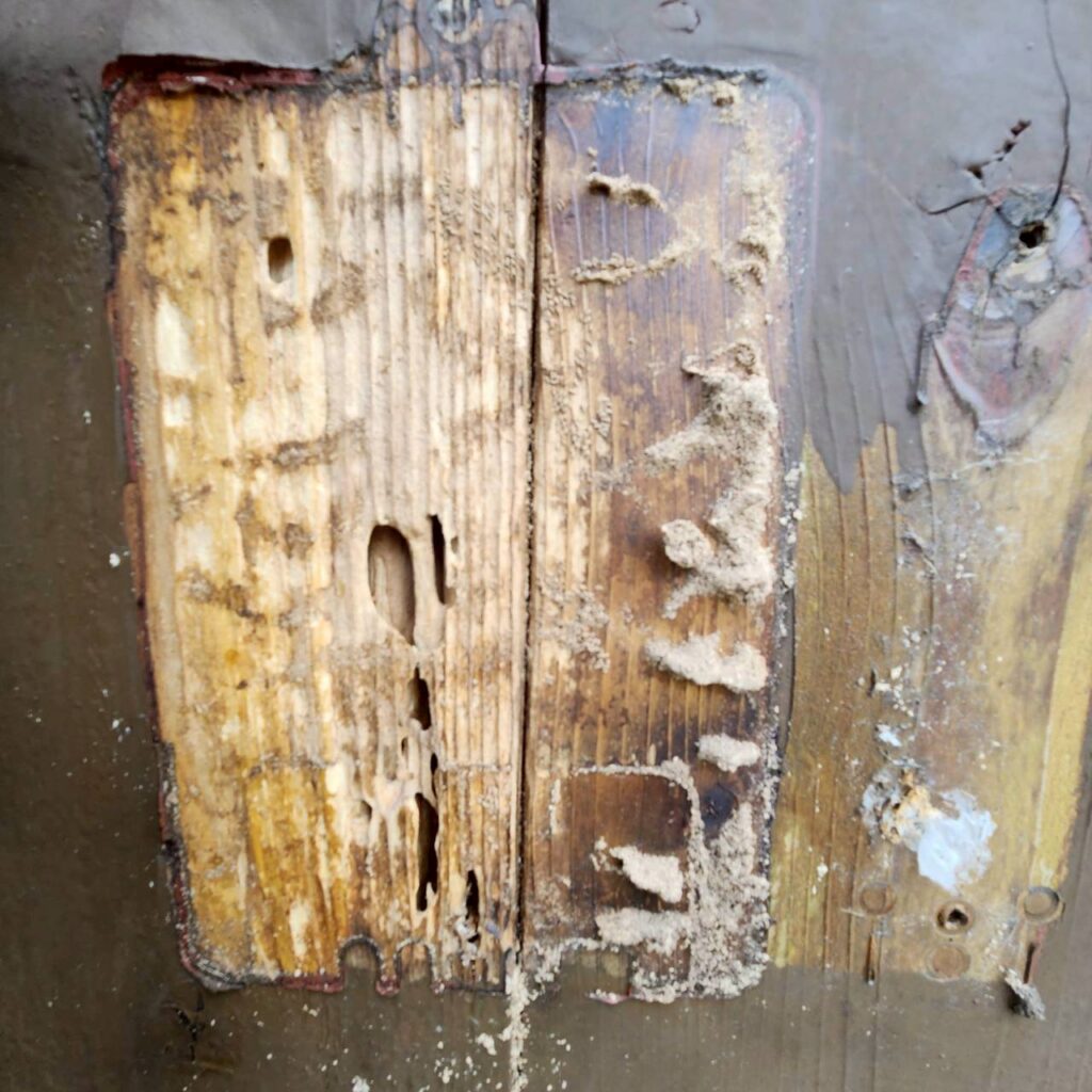 外から見た段階では、それほど傷みが目立つ外壁には見えませんでした。しかし、木製の外壁は表面がきれいに見えていても、内部や器具の裏側で傷みが進んでいることがあります。
