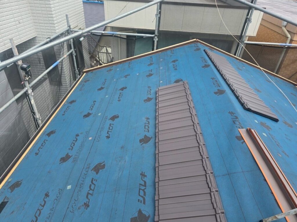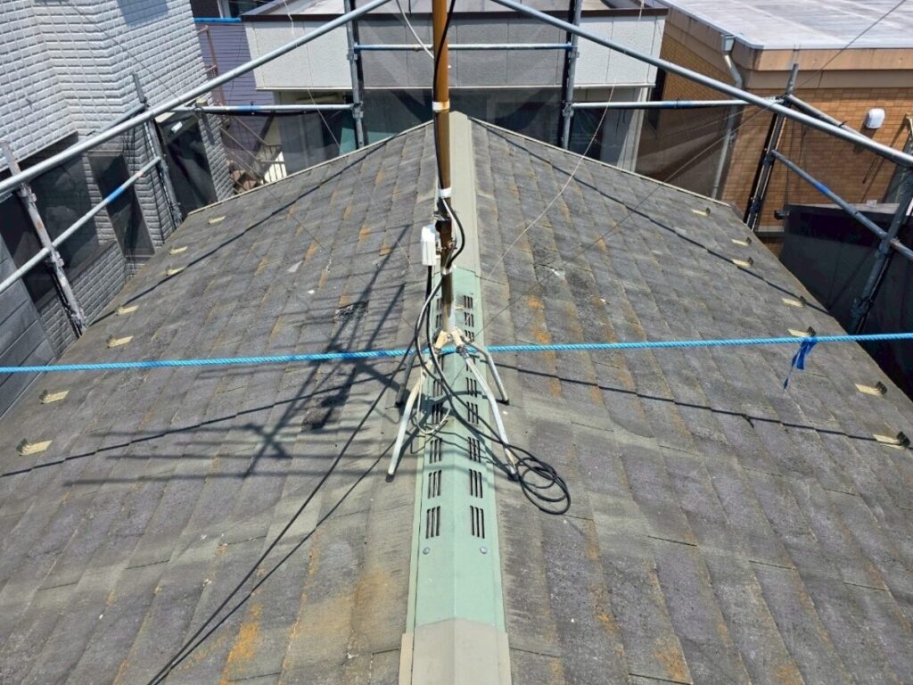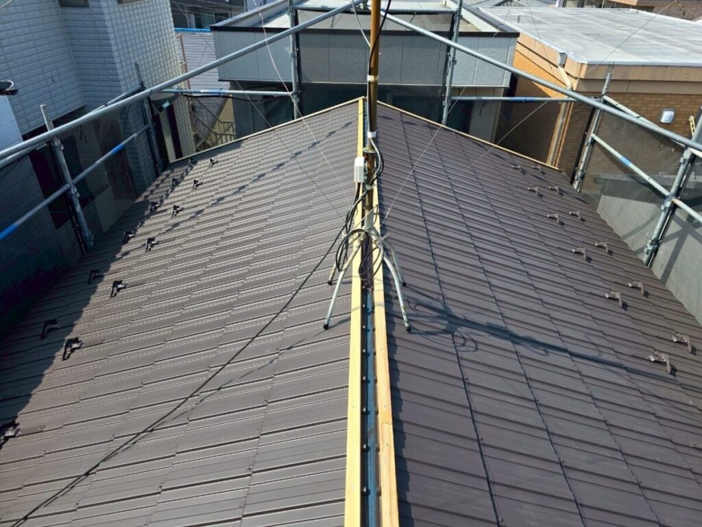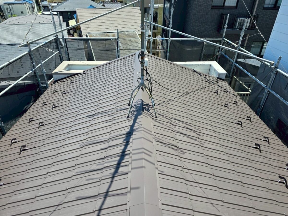 先日完工しました川崎市のレクトプルーフの現場です、現在は足場も取れましたが近隣様が2件ご契約してくださったので入れ替わりで2件の足場が掛かってます、施工して頂いた職人はマックス建材の専属の職人さんで御兄弟の板金屋さん、私達がお願いすると必ずその御兄弟のが施工して下さいます、施工も丁寧で毎回お客様受けも良く助かっています、今回の屋根は施工的には簡単な切妻屋根なのですが三階の屋根で足場も隣接してる建物が近く荷上げがて作業で大変な現場なので技術的な事よりも体力的に大変な現場だったのではと思います、ウチの地元近辺では自社職人が施工しているレクトプルーフですが私的には1番のお気に入りの屋根で見た目にも機能的にも金額的にも一推しの屋根材です!また外壁も含めて施工事例でご紹介させていただきます。