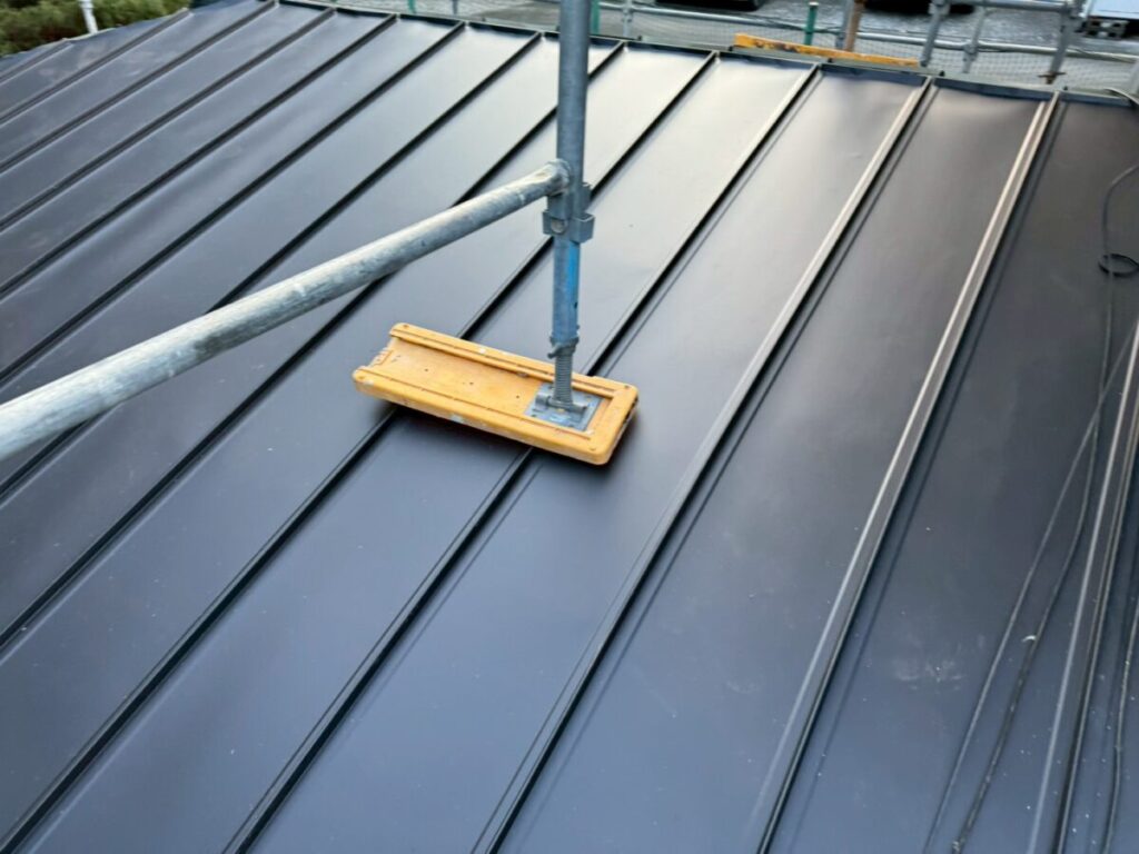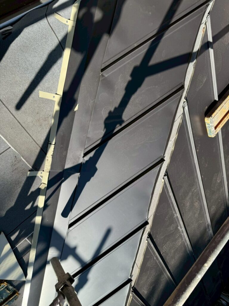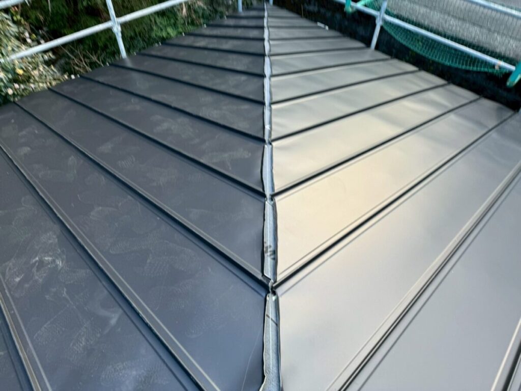 立平葺きは、1枚の板金を上から下まで通して施工する屋根工法で、