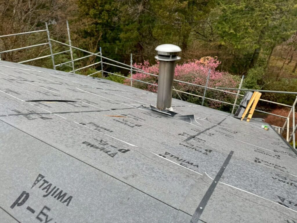 また今回の現場では、屋根から煙突が立ち上がっているため、納まりについて事前に打ち合わせを行い、次回の工程で板金による適切な処理を行います。