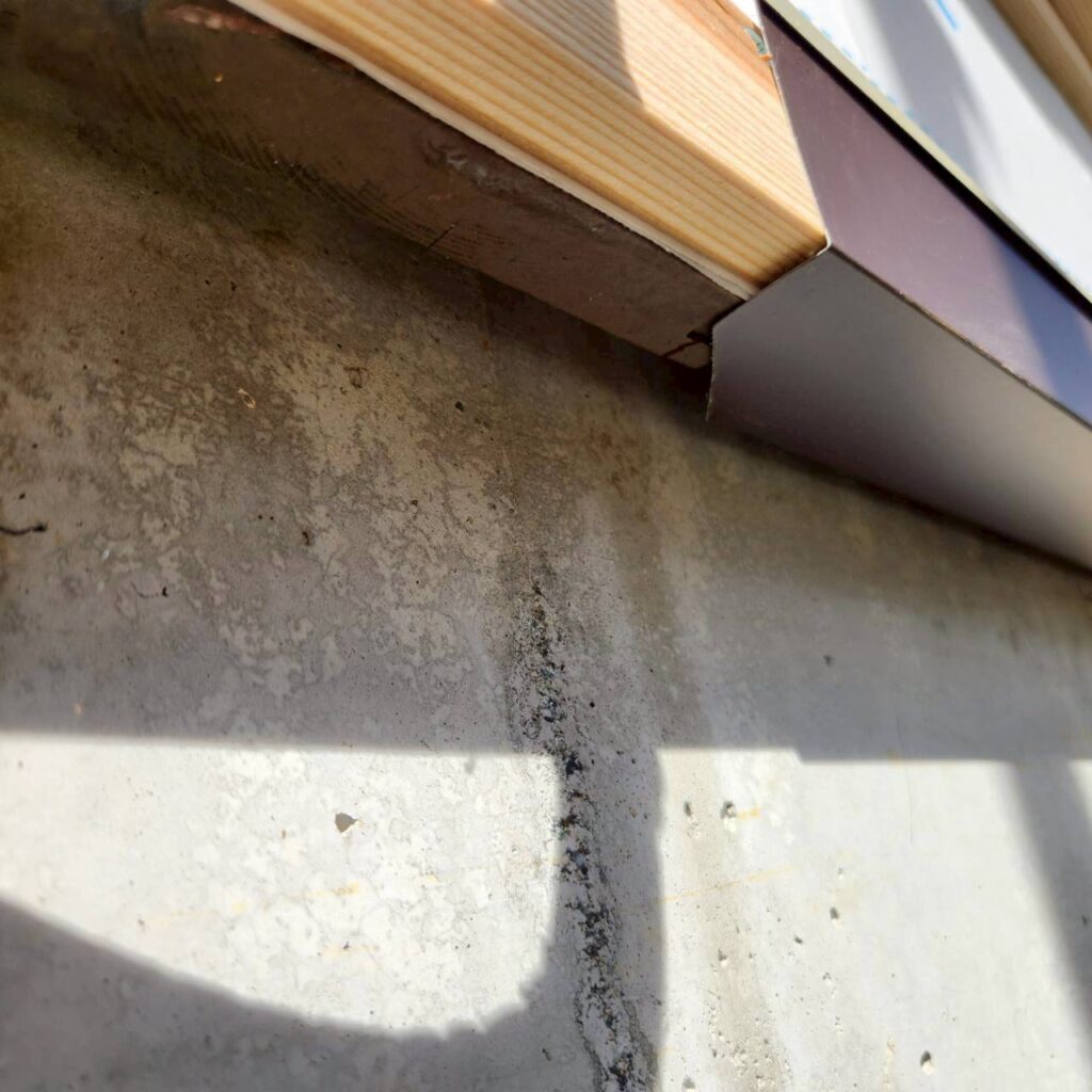 立て張りの場合、土台部分の水切りは比較的シンプルな形状になるため、下からのぞき込んだ際に下地の木部が見えてしまう場合があります。通常はあまり目立たない部分ではありますが、こうした細かな部分の処理が、完成後の印象を大きく左右します。