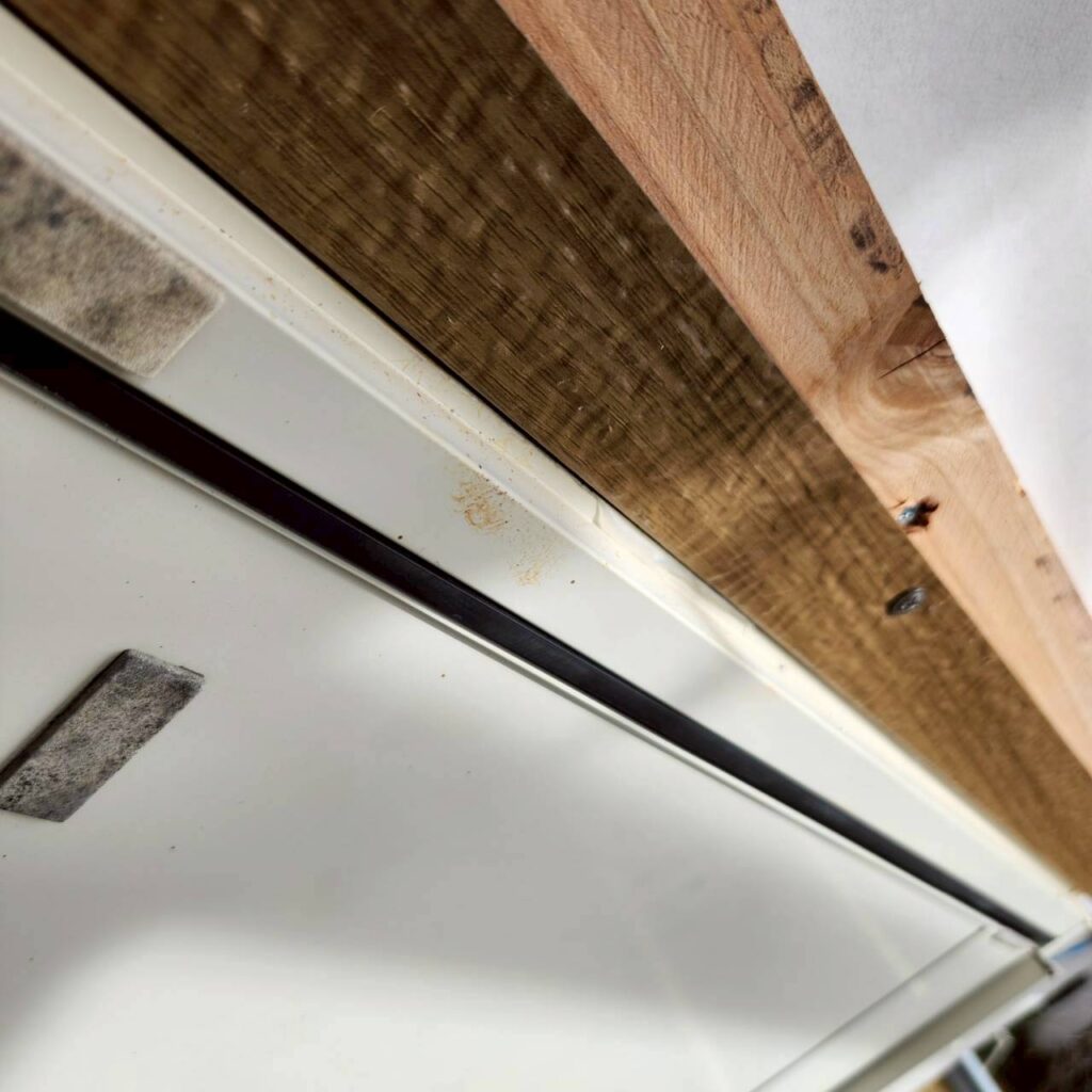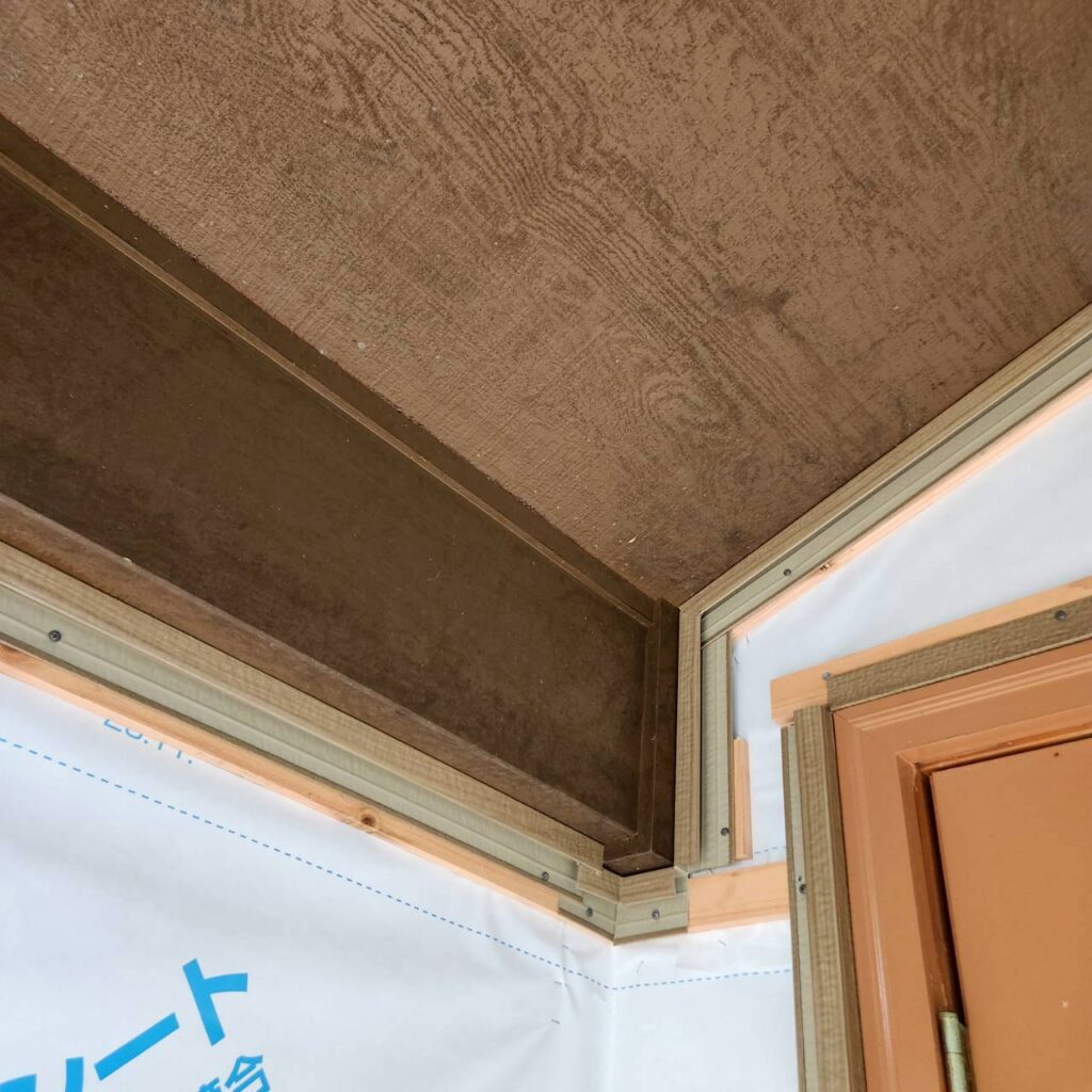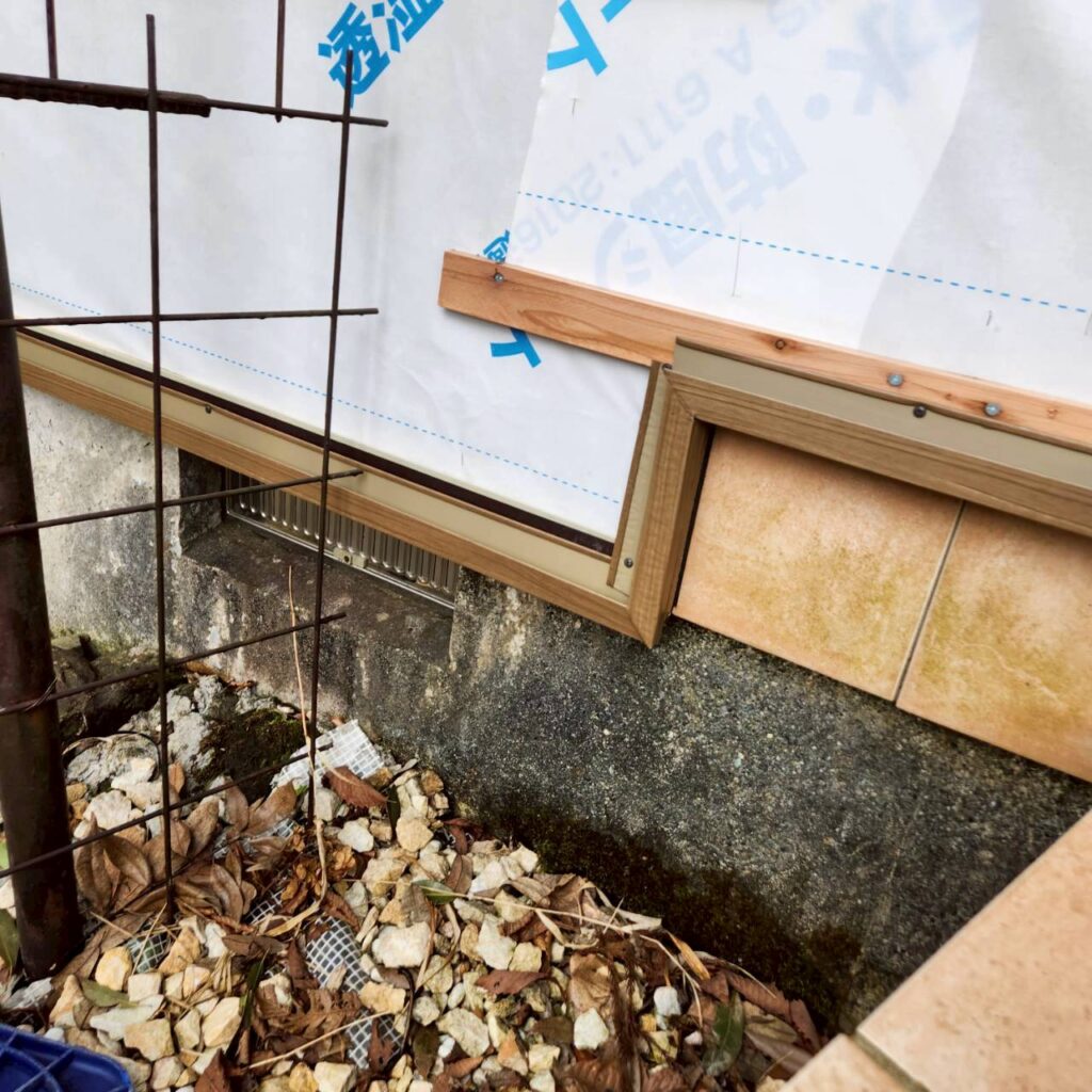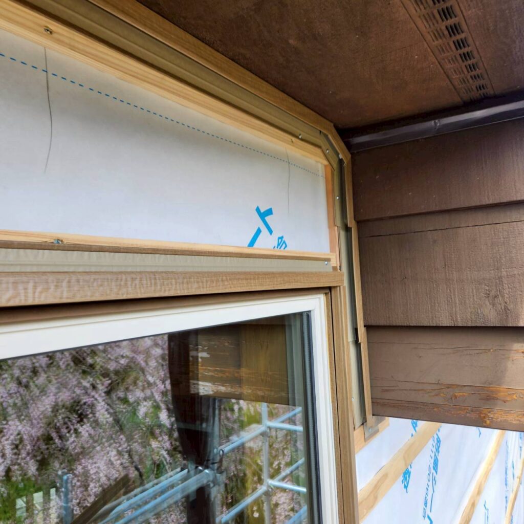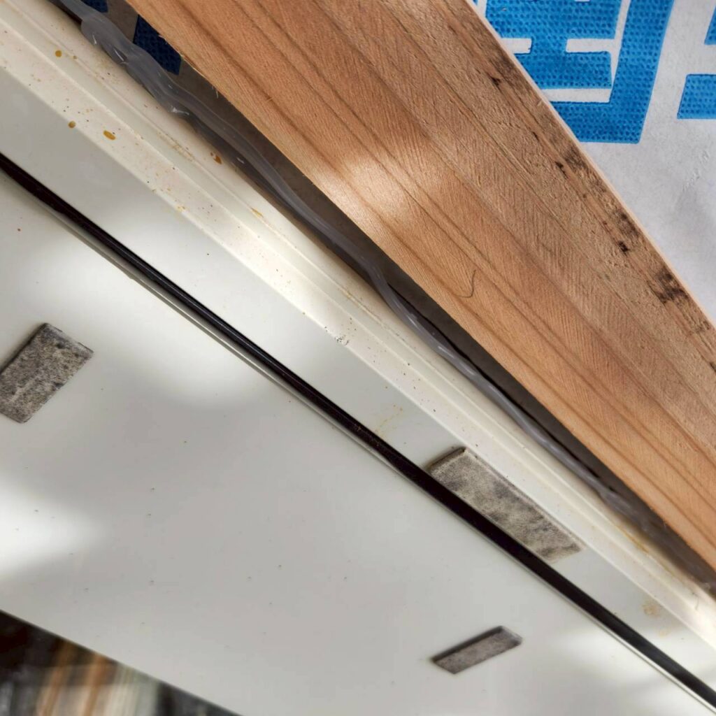また、サッシまわりにも額縁を取り付けていきますが、今回の現場のようにサッシの出が少ない場合は、下から見たときに下地の木材が見えてしまうことがあります。