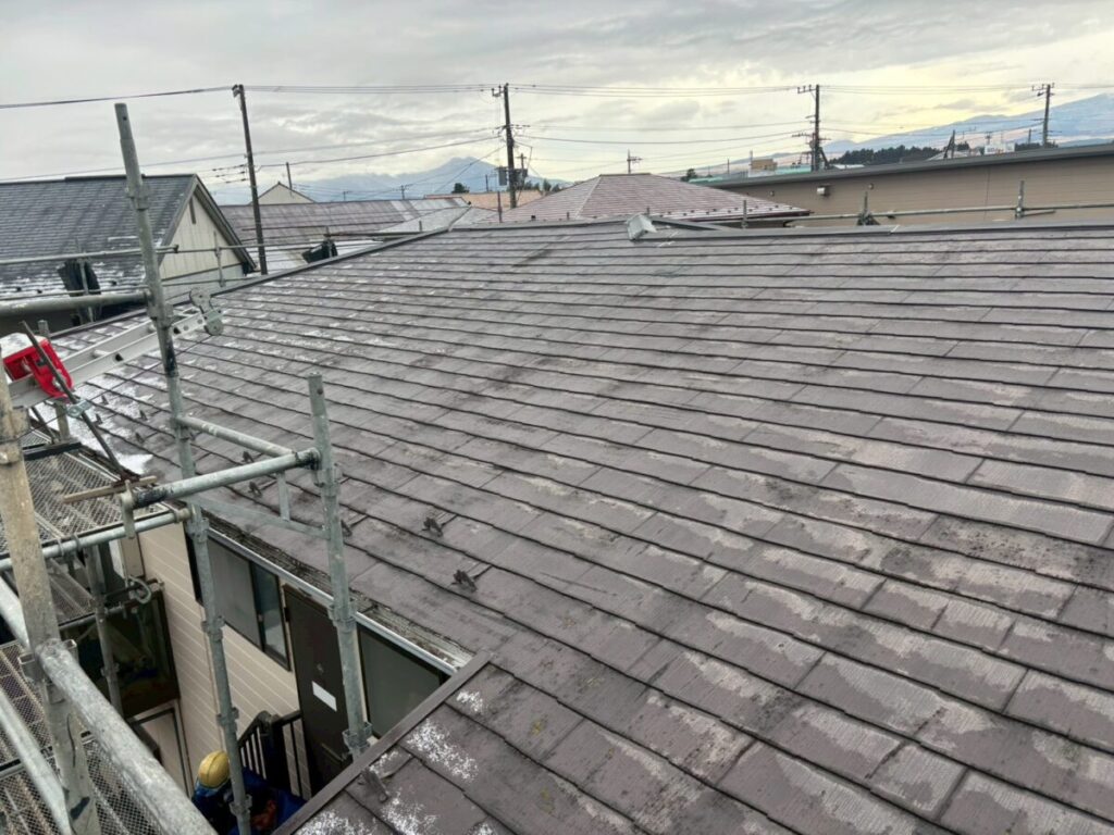 施工中の金属屋根材レクトプルーフが仕上がりました、現場的にはこの後も雨樋の取り替えや外壁の雨漏り箇所の補修工事がありますが、メインの屋根カバー工事は完成です、また後日施工事例でご紹介しますが最後の画像が施工前となります、見た目的に立体感が増したのが分かるかと思いますが、これ大袈裟で無く画像よりも実物を見ると全然違って見えます、特に足場の上からでは無く家の下から見た場合に既存の化粧スレートは、より平らに見えてしまうので立体感のあるレクトプルーフは凹凸の光の当たり方で陰影がハッキリとして、より立体感がある様にみえますので施工したお客様は皆様驚かれます、私共もお客様の喜ぶ顔が大きいのでお勧め商品として一推ししています。