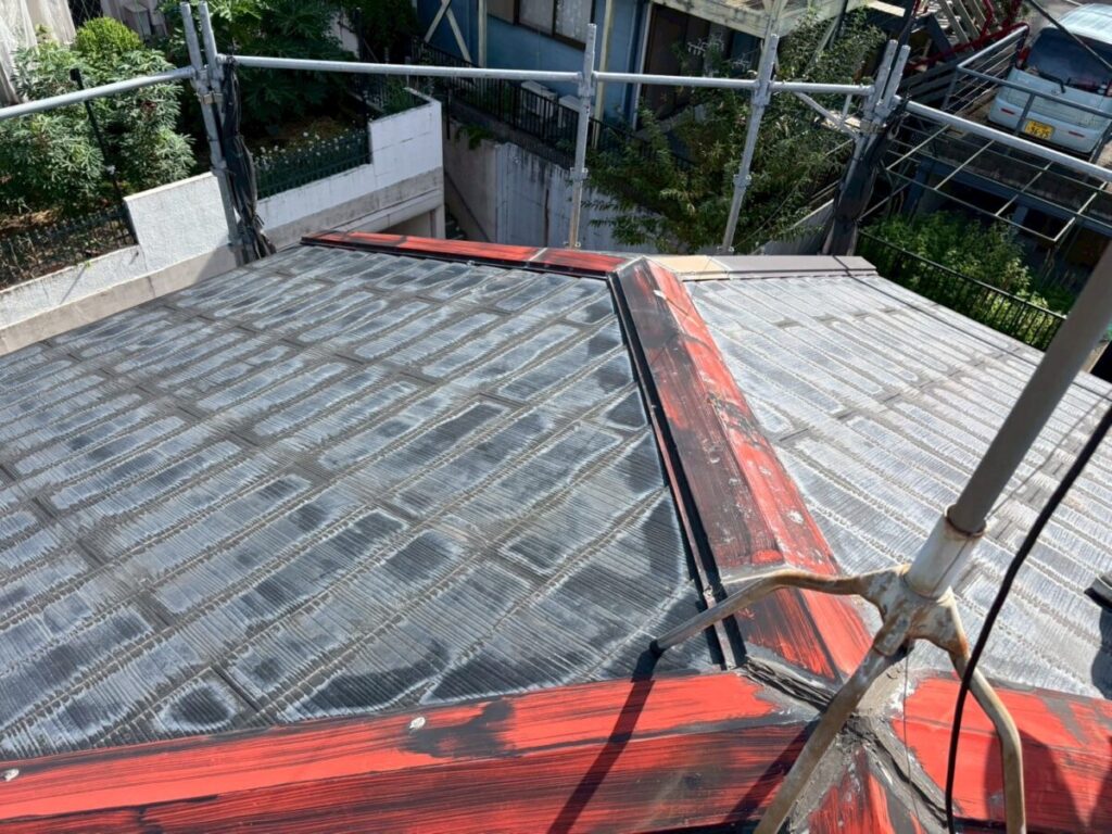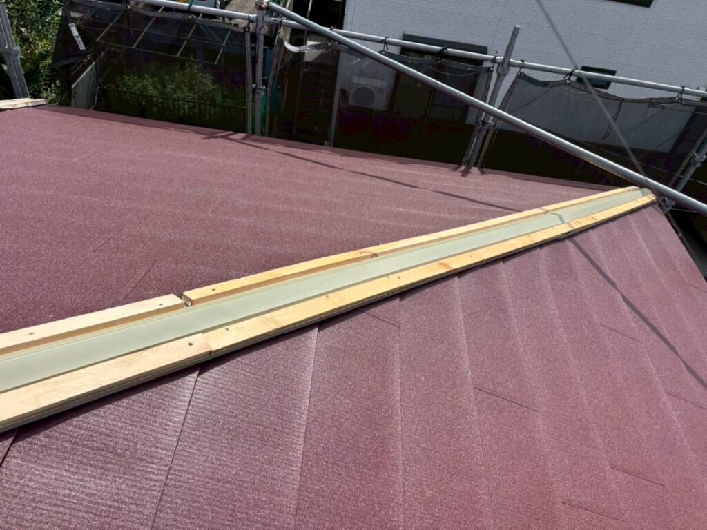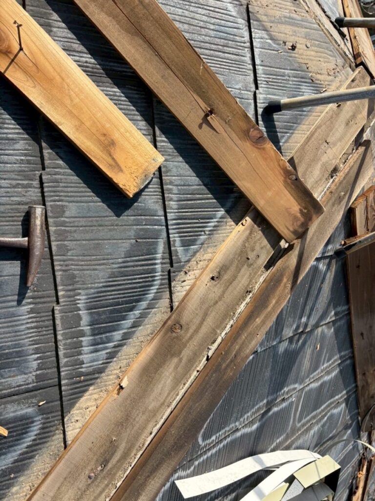 今までも何回かご紹介しましたが、我々は金属横葺き屋根では自社製のオリジナルの仕様で工事しています、画像の初めの方が既存の棟のを剥がして下地の貫板を撤去する所なんですがメーカー推奨の仕様も貫板か人工木材となっています、でも人工木材は熱に弱く腐らないけどモロくなります、木材は熱に強いけど湿気が籠ると腐ります、そこで考えたのが金属下地で木材を包み込んで水に接触させない仕組みです、この時の木の厚みも問題で通常貫板は15mm前後なのに対して25mmの木材を使用します木が厚い事によってビスを打っても割れにくいので強い強度が保てます、金属下地だけで棟板金とビスで絡めるでも良いのですが、その場合は太いビスを使わないと強度が出ないので屋根材の表面でビスを使わない金属横葺きではビス頭が目立ってしまうので木材を絡めて小さめの頭のビスを使用します、逆に石付き屋根等は元々表面がボコボコしていて屋根材同士もビスで打ってあるので太いビスを棟に打っても違和感が無いのでメーカーの標準仕様も金属下地のみで問題有りません。