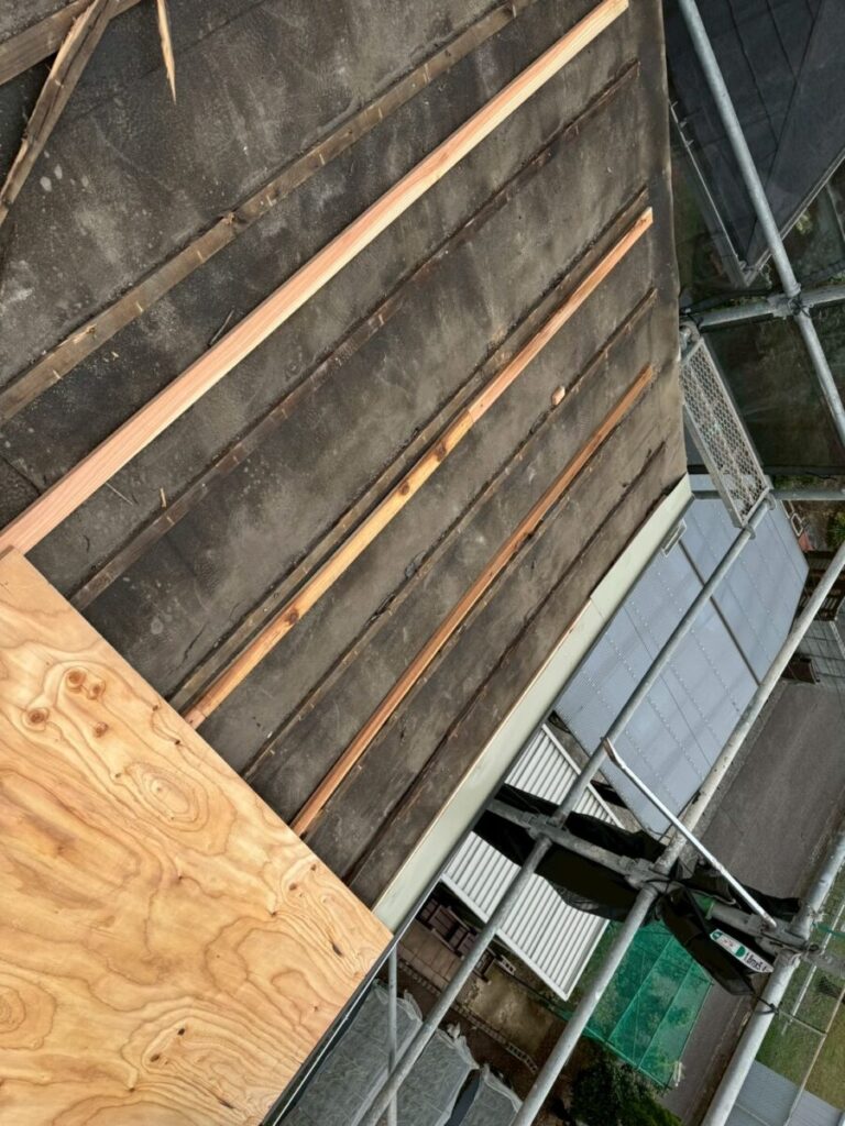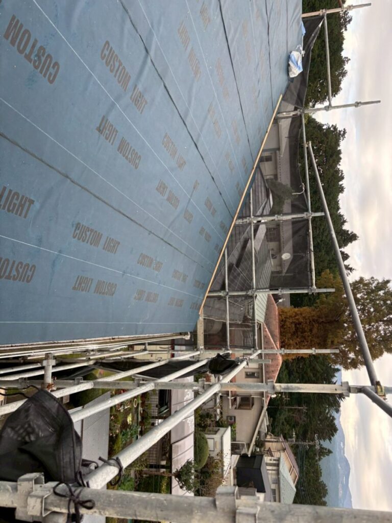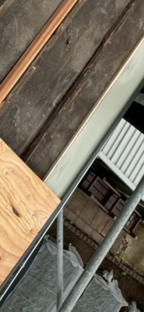 現在葺き替え工事をさせて頂いています現場となります、雨漏りの原因は2階の棟がズレてしまい雨水が入り込んだ事が原因ですが築年数もたっていると事からコンクリート瓦と下地のルーフィングの劣化具合から替えて下さいとの事で今回の工事となりました、私達の下地のやり方は瓦を外した後は下地も取らずに半貫を打ち合板を貼ります、これは下地の防水層も残しつつ空気層を作る意味が有りますし、万が一の通り雨が降っても元々の防水層がある為に安心です、新たに貼る合板も下から見たら裏地が見えてしまうので先に画像の様な裏板板金を作り取り付け、そこに合板を刺していく形をとっていますので仕上がりも美しく新しい合板の劣化も防ぐ事が出来ます。