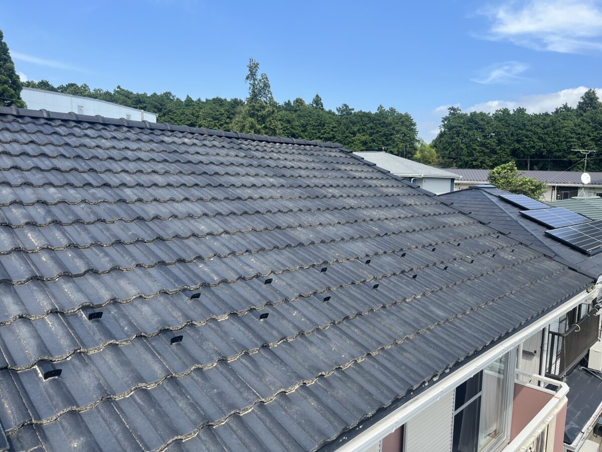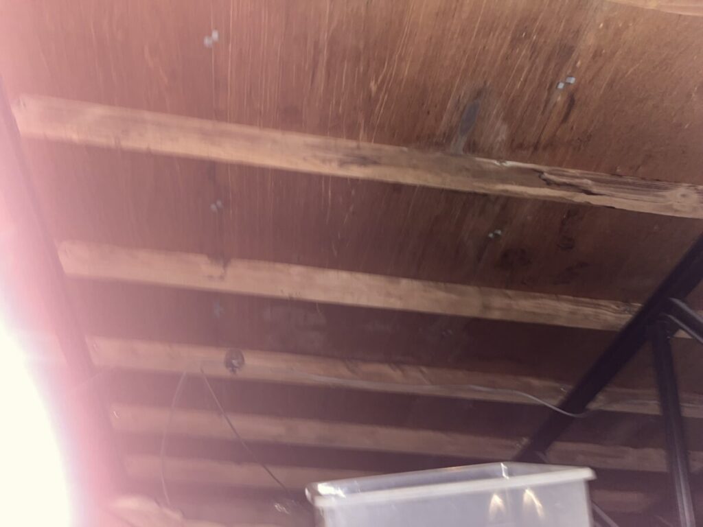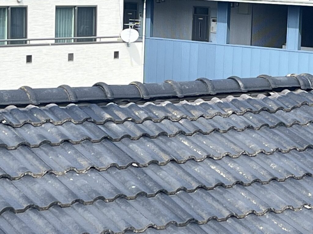 今回の雨漏りは天井裏から見させていただきましたが屋根の合板に染みがあったので雨漏り調査としては1番簡単なケースです、そのまま屋根を確認しますと雨漏りの染みの有るあたりの棟の部分がズレて下地が出ている状況です、屋根材はコンクリート瓦なので割れ易く実際に所々割れが確認出来ましたので屋根に上がる事は辞めておきました、お見積もり内容には昇降足場を設けさせて頂く様にし屋根にハシゴを掛けると割れる可能性が大きい事をご説明させて頂き、補修のお見積を提出する事で、お話はまとまりました。
