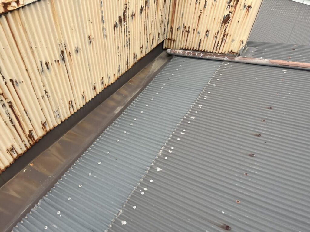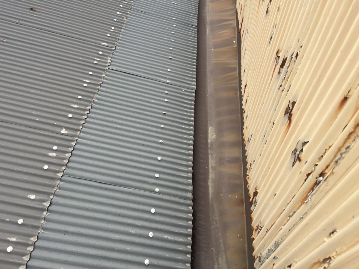 雨漏りの現場調査に伺いました、雨漏り箇所の屋根に上がってみると、鉄板小波の屋根だったのですが先端部分が50センチ程継ぎ足しされていました、鉄板小波を継ぐ事はダメでは無いのですがジョイント部分は水を吸い上げるので下地の防水ルーフィング頼りになります、なのでなるべく一枚物で注文して取り付けるのが一般的です、今回の感じは多分軒先部分が錆びて穴が空いた為に先端50センチ程切断して新しい鉄板小波を刺したと考えられます、その時に下地のルーフィングは古いままなのでルーフィングの寿命と重なり今回の雨漏りに繋がったと考えられます、その場限りの工事をすると後でやり直しになるので余計に予算がかさんでしまうので注意が必要です