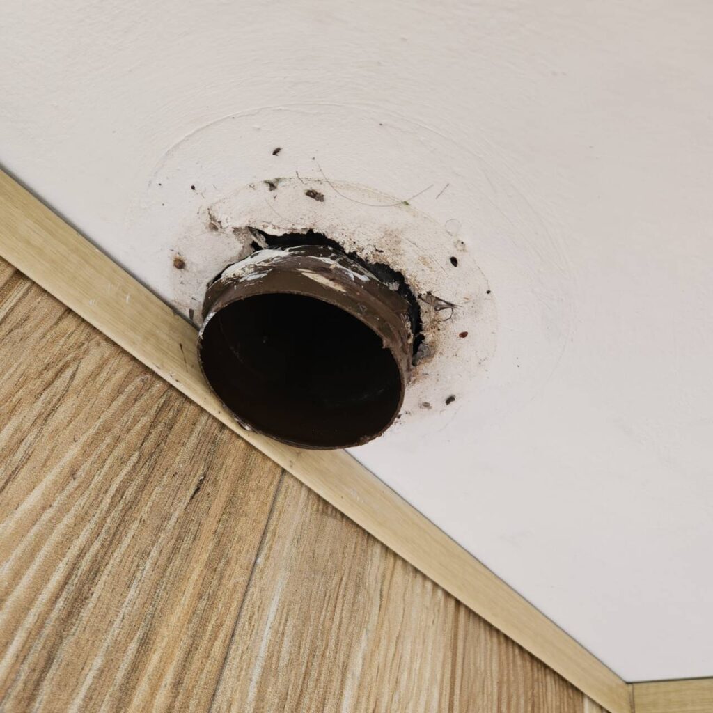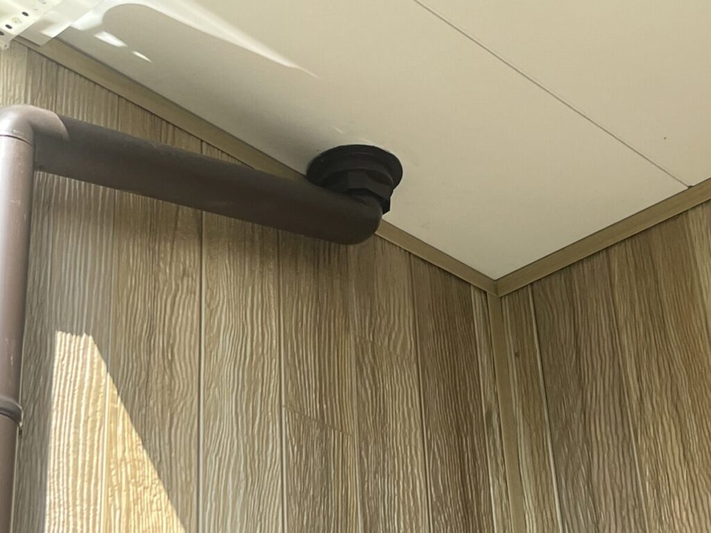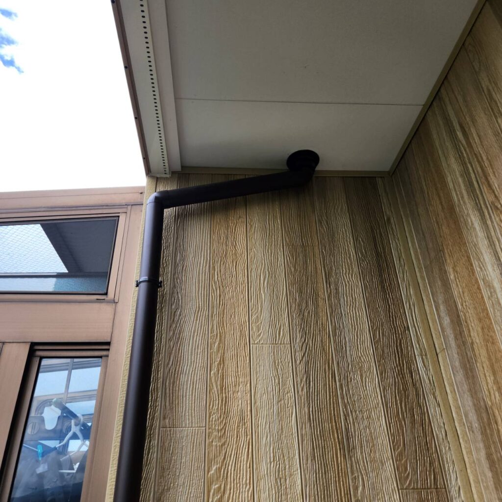 でした。役8ヶ月前、去年の年末に完工したはずの、お客様からお電話があり雨樋から少し水が壁に伝わるとの事を伺い始めは何の事か分からずに現場に伺いました、バルコニーのポーチドレンからの水漏れという事で直ぐにバラして中を見ると軒天の中に隠れているドレンからバルコニードレンに繋げるパイプが足りておらず中での水漏れを起こしていました、画像では軒天からパイプが出ている感じになってますが、コレは直した後で直す前は、このパイプが出て居ない状態でした、コレは完全に私共の凡ミスで今回お客様にご指摘を受け直す事が出来ましたが、発見が遅れたら軒天に雨染みが出来てしまったり不具合が発生してしまう所でした、今後共この様なミスが起きない様に身を引き締める必要があると改めて感じる出来事