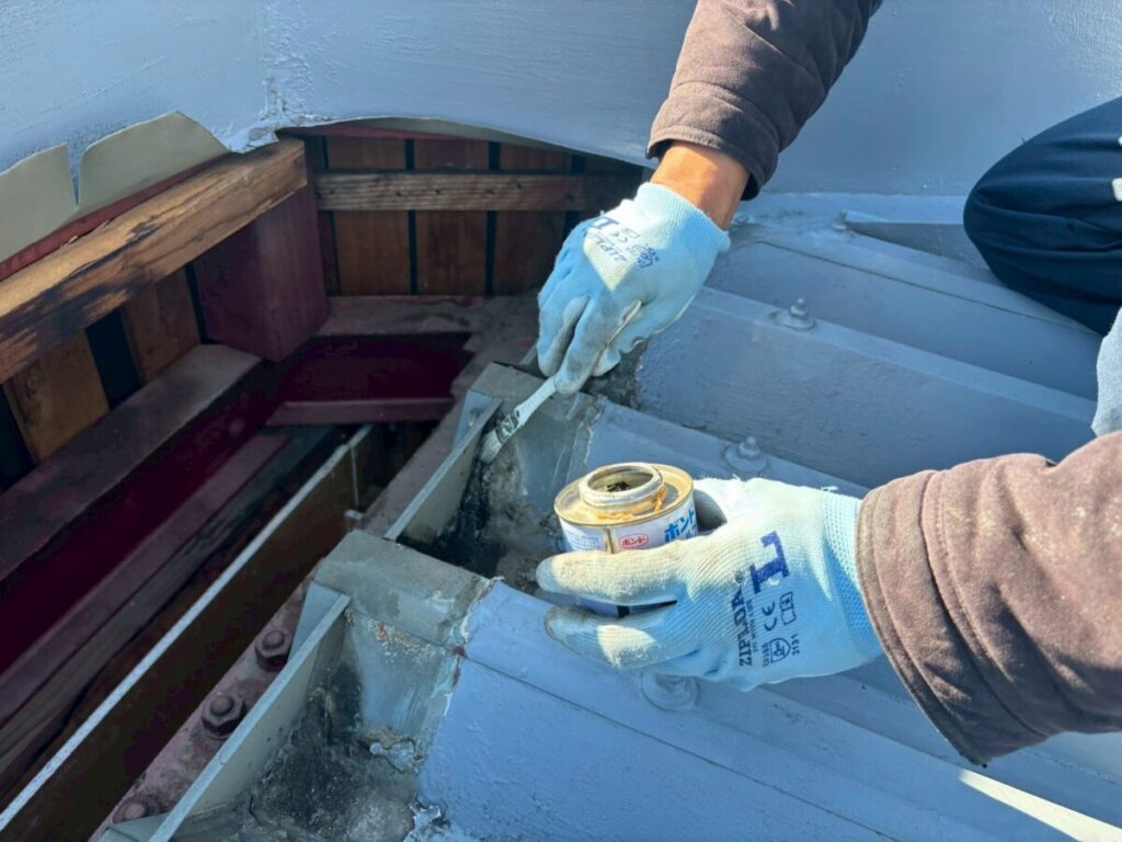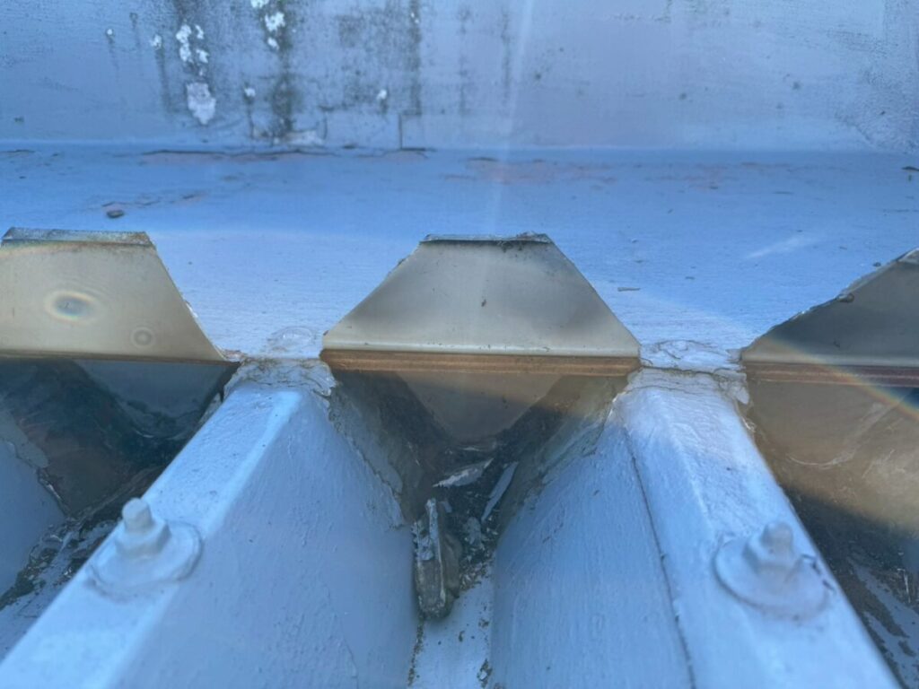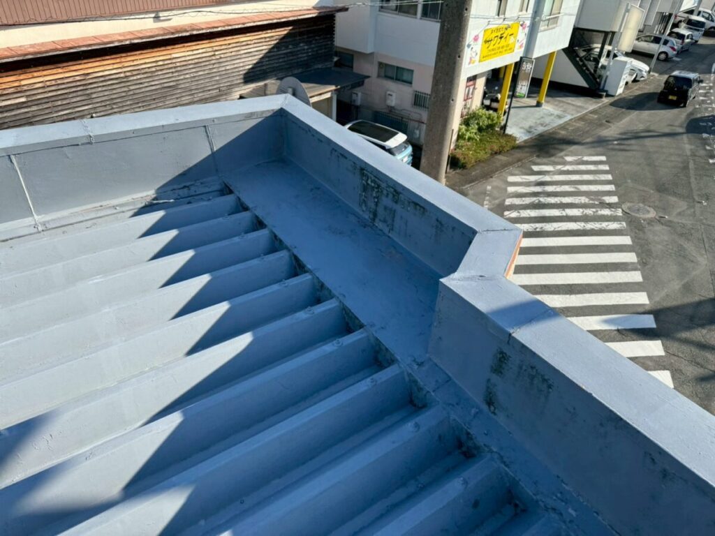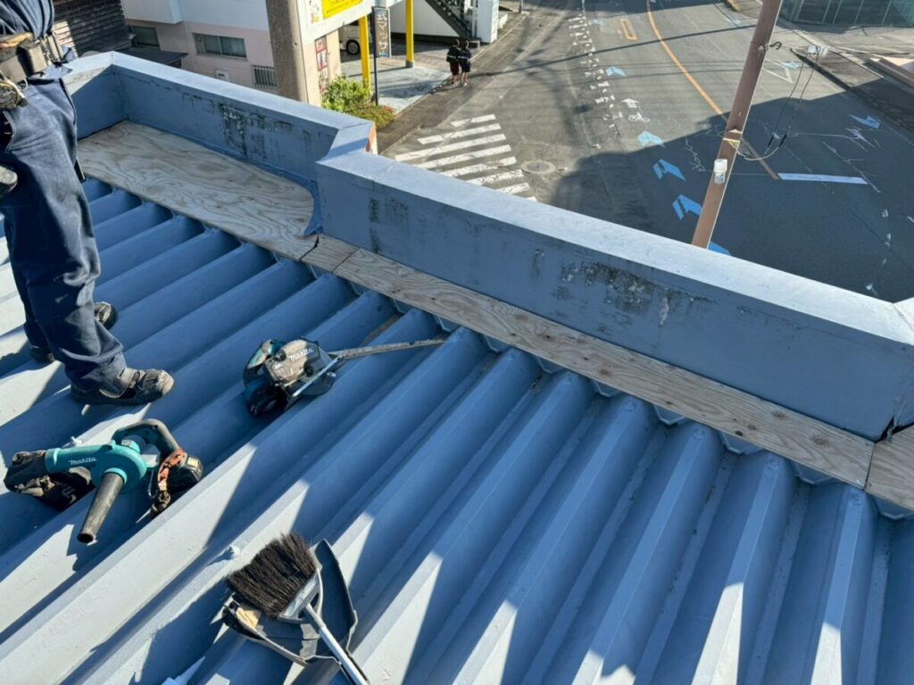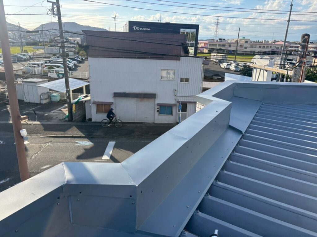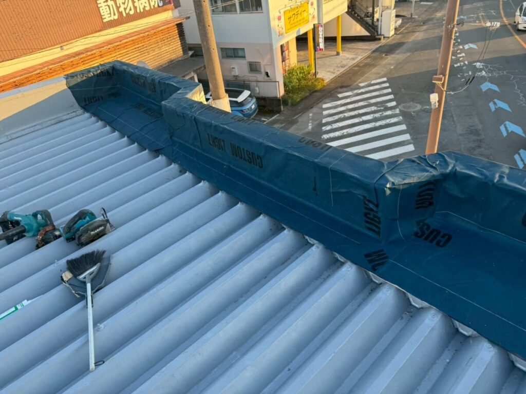 今回は三島市のスルガ住研さんからの下請け現場です、88型折板の雨漏りの半分以上の雨漏り原因を占める感じで頻発している止め面戸からの雨漏りです、どう言うことかと言うと折板の水上には雨押さえが着いています、その中に折板の水が行かない様に止め面戸と言う部材を付けてコーキングで止水して、その止め面戸が劣化しにくい様にエプロン面戸と言う部材でカバーして雨押さえ板金を取り付けます、つまり普段見えてる面戸を捲ると画像の2枚目の様に奥にもう一枚面戸が入ってる事になります、ここのコーキングが劣化して雨漏りします、こうなる事は施工の段階で予測が付きますので止め面戸を使わないで折板の谷の部分を立ち上げる施工方法もあり私は必ずそうします、今回も止め面戸のコーキングをやり直して雨押さえ等戻していき完成です。
