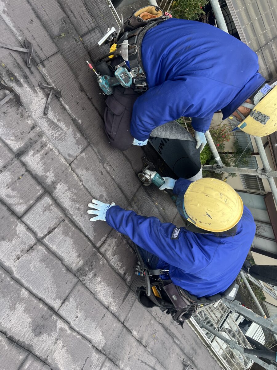 今年初の屋根カバー工事は御殿場市です、屋根の上には薄っすらと雪が積もってました、地元の富士宮市ではなかなかありえない光景です、ブロアーで雪を払い除けて現場での打ち合わせを済ませました、本日は既存の棟を撤去してルーフィングを貼り役物等を取り付けるのですが、その前に既存の雪止め金具を撤去します、サンダーで切断するのでキリコが近隣に飛び散らないように1人が切断、1人がシートで火花をカバーしながら撤去していきます、今年は第二週からのスタートですが同じ週で3現場、御殿場市での足場掛けがあり、御殿場市からのスタートという事となり寒さとの戦いになりそうです。