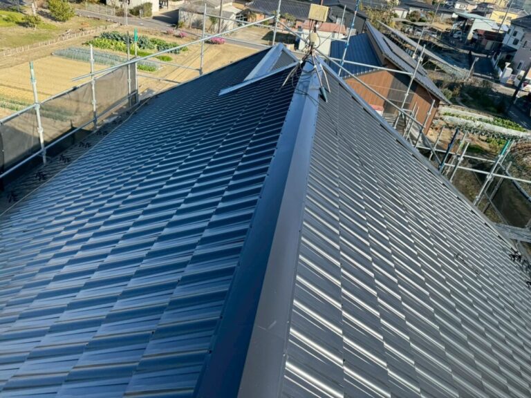 棟板金、ケラバカバー、雨押さえなどの板金役物を取り付け最後に軒先の雪止め金具を取り付け完成です、初めてマックスハイプルーフを施工してみての感想は立体感があるので洋風の建物に勿論合うのですが、純和風にも全く違和感なく格好良く収まる屋根材だろうと思いました、外壁塗装やコーキングの打ち替えは今回の現場は諸事情により省略させていただきます、ありがとうございました。