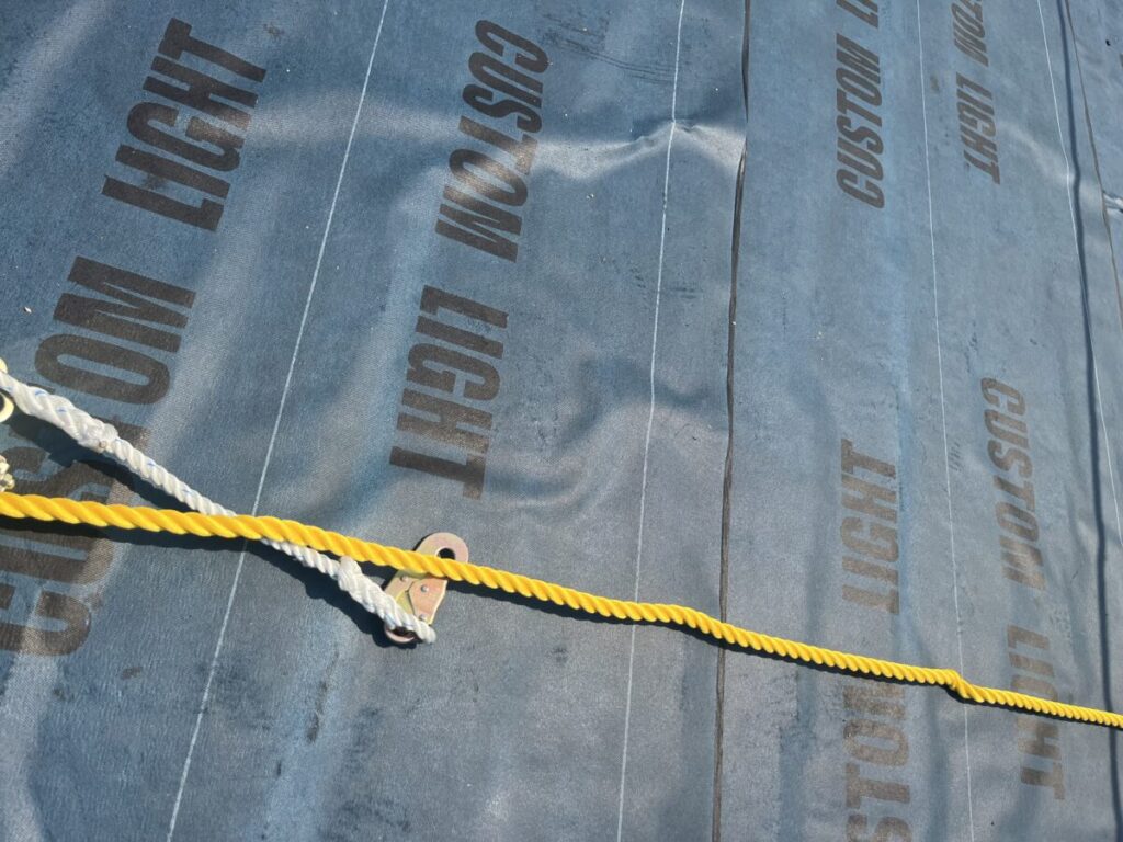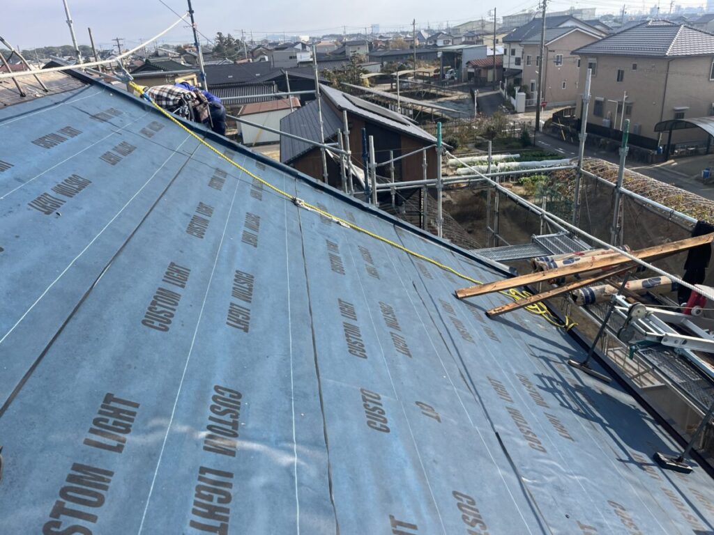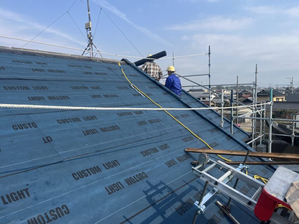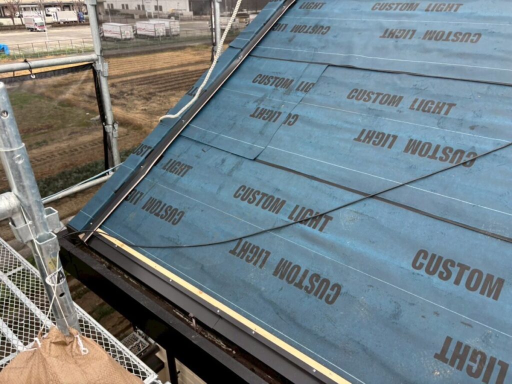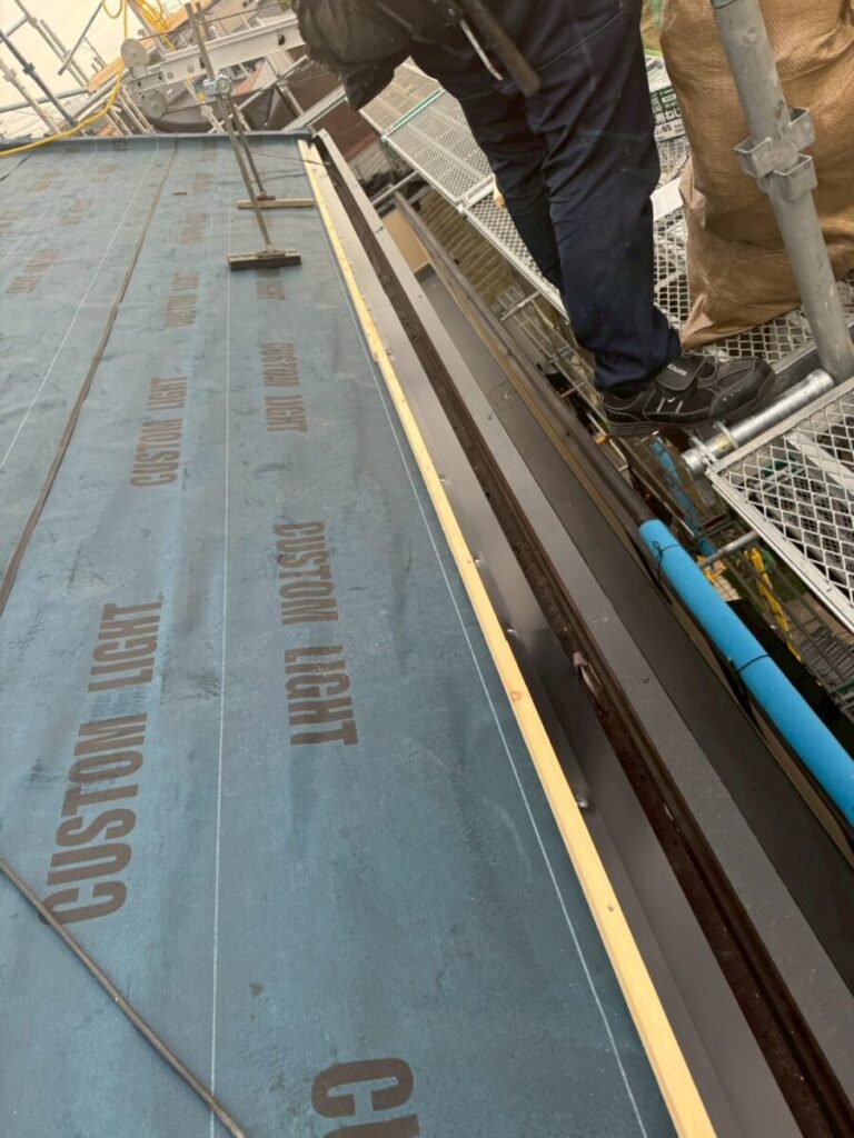 今回の屋根は6寸勾配ですので屋根足場を組むかどうかのギリギリのラインです、元々の屋根が状態が悪いと滑って危険なのですが今回は普通に歩けるので安全対策の親綱と子綱を設置し子綱には安全帯を簡単に設置しスライド出来るアタッチメントのような部材を取り付けました、現場の職人からしたら、これすらも必要無いと言われてしまいましたが何かあったら困ると言う事で安全帯で安全対策をする様にお願いし、粘着層付きルーフィング貼りからスタートいたしました。