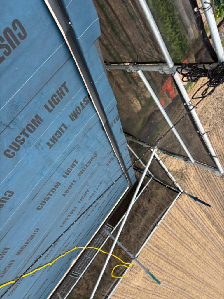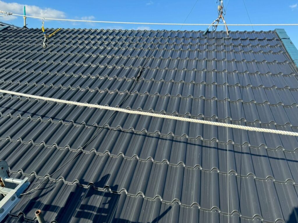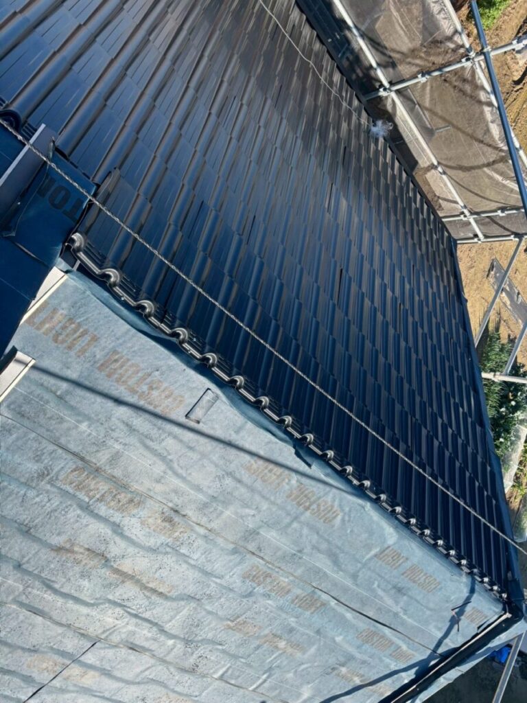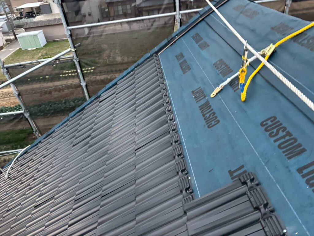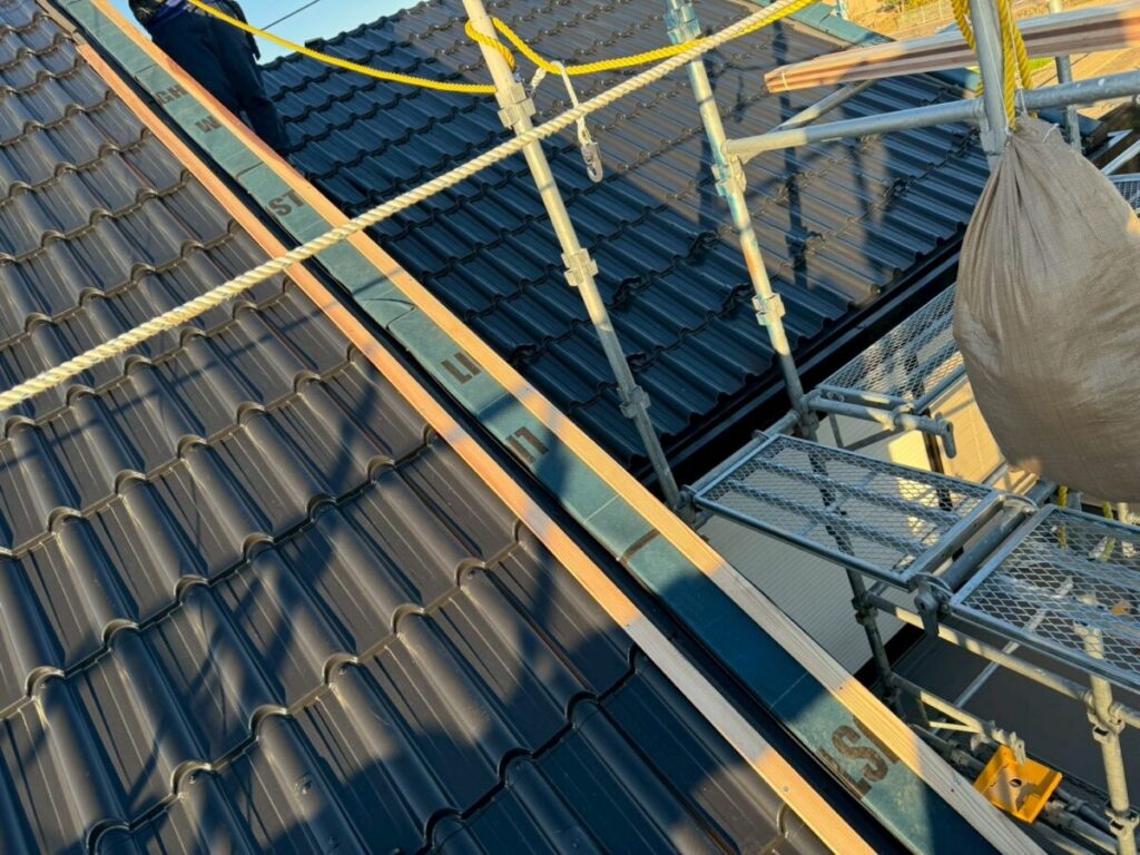 今回の屋根は6寸勾配ですので屋根足場を組むかどうかのギリギリのラインです、元々の屋根が状態が悪いと滑って危険なのですが今回は普通に歩けるので安全対策の親綱と子綱を設置し子綱には安全帯を簡単に設置しスライド出来るアタッチメントのような部材を取り付けました、現場の職人からしたら、これすらも必要無いと言われてしまいましたが何かあったら困ると言う事で安全帯で安全対策をする様にお願いし、粘着層付きルーフィング貼りからスタートいたしました。