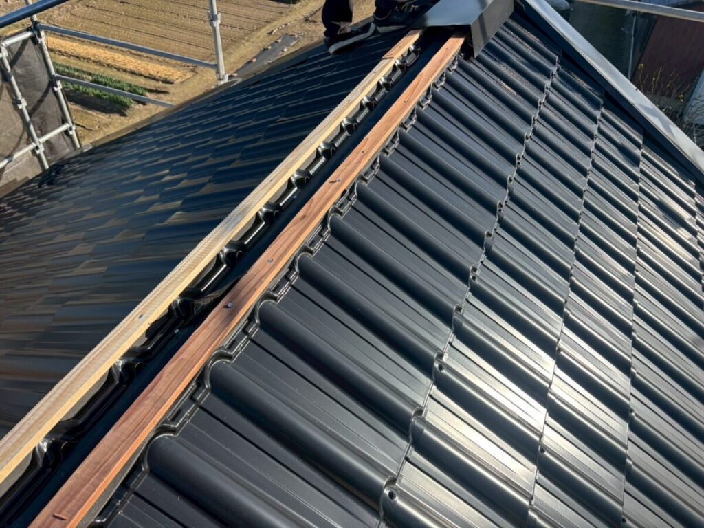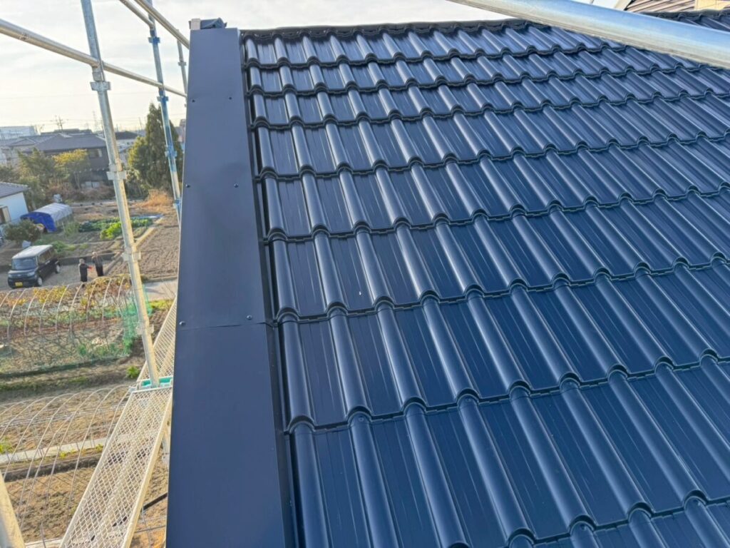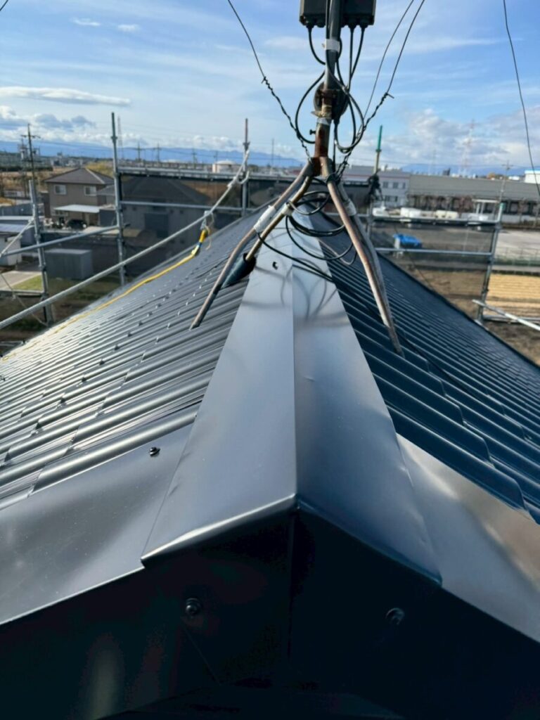棟板金、ケラバカバー、雨押さえなどの板金役物を取り付け最後に軒先の雪止め金具を取り付け完成です、初めてマックスハイプルーフを施工してみての感想は立体感があるので洋風の建物に勿論合うのですが、純和風にも全く違和感なく格好良く収まる屋根材だろうと思いました、外壁塗装やコーキングの打ち替えは今回の現場は諸事情により省略させていただきます、ありがとうございました。
