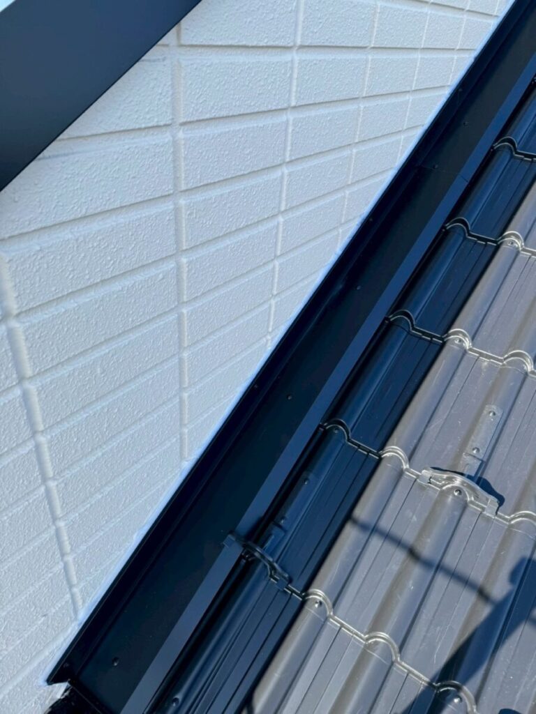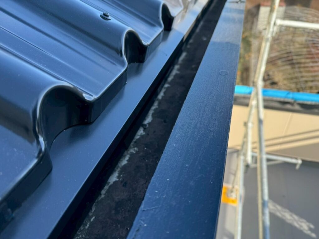 今回の現場は既存のケラバが大きく既製品は取り付け出来ませんので事前に作業場で加工しています、下地板金のケラバの捨て谷は通常の物が使えますので取り付けます、軒先はセットバックスターターと言う既存の雨樋に落ちる雨水の出幅と高さが変わらない役物を取り付けます、今回の屋根材の特徴的な事は立体感が大きいので軒先部分の屋根材本体だけ隙間を隠す造りになっていて軒先専用の屋根材が別売りとなっている事です。