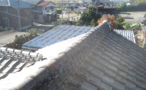 今回の屋根は6寸勾配ですので屋根足場を組むかどうかのギリギリのラインです、元々の屋根が状態が悪いと滑って危険なのですが今回は普通に歩けるので安全対策の親綱と子綱を設置し子綱には安全帯を簡単に設置しスライド出来るアタッチメントのような部材を取り付けました、現場の職人からしたら、これすらも必要無いと言われてしまいましたが何かあったら困ると言う事で安全帯で安全対策をする様にお願いし、粘着層付きルーフィング貼りからスタートいたしました。