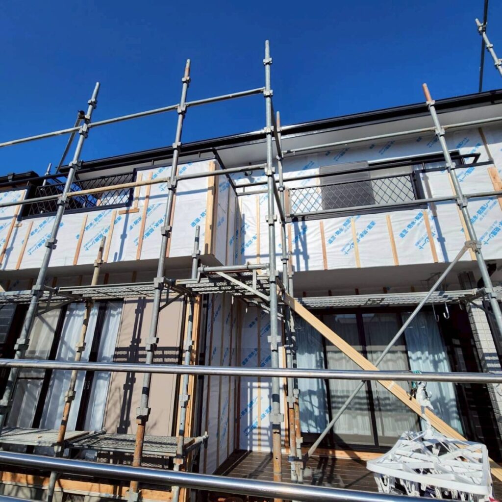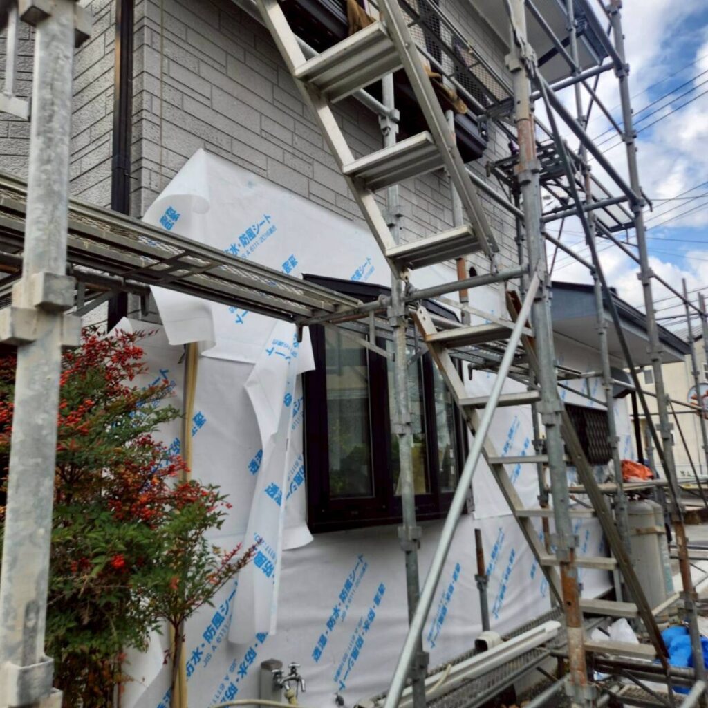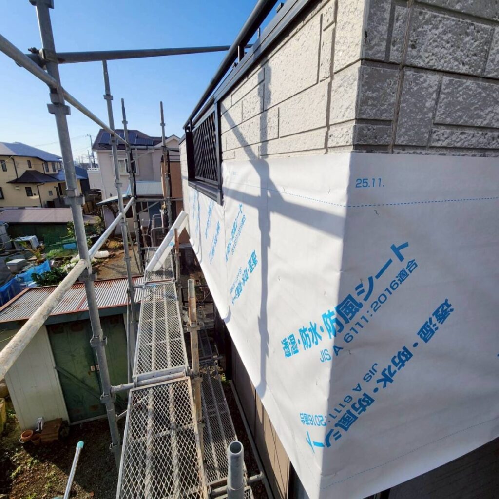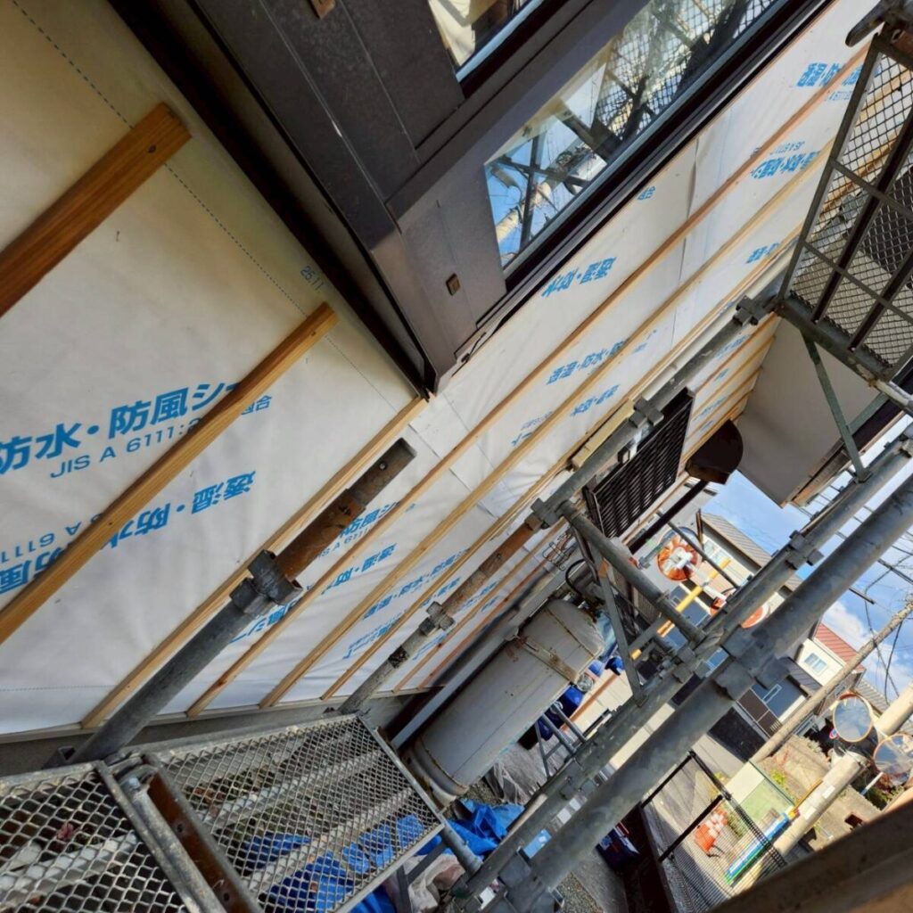 まずはじめに、外壁全体に透湿シートを貼っていきます。外からの雨水を防ぎながら、内部にこもった湿気を外へ逃がすための下準備となる工程です。
