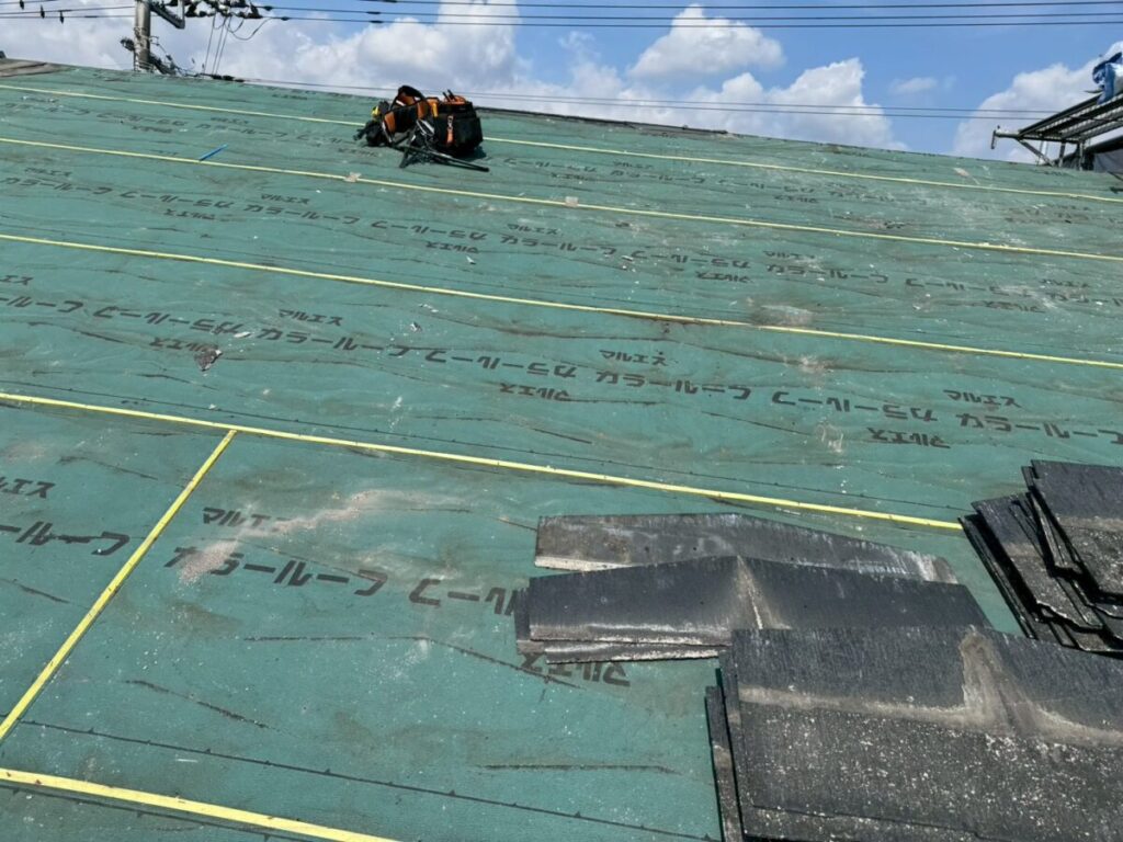 今回は、既存のルーフィングは残し、屋根材のみを撤去する形で工事を進めています。