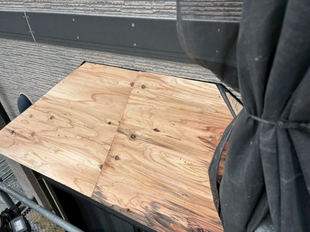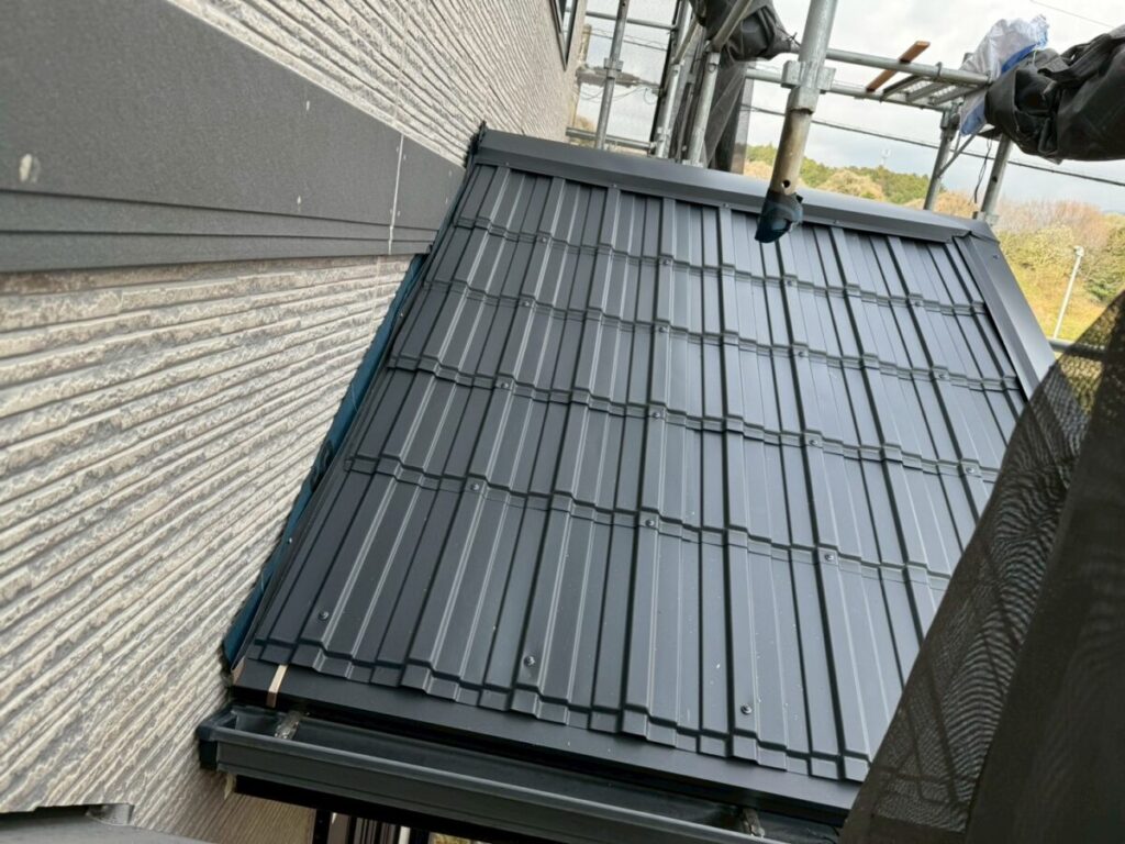 施工は他の屋根部分と同じ流れで進め、まず合板を張り、その上にルーフィングを施工し、今回使用している屋根材を張りました。