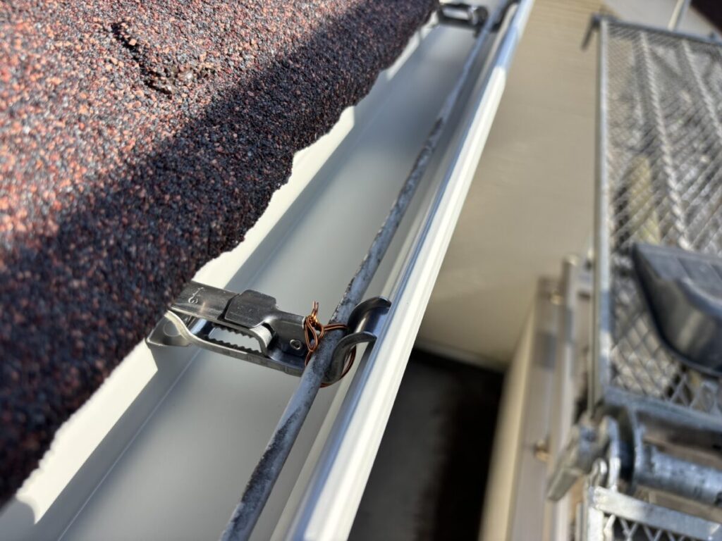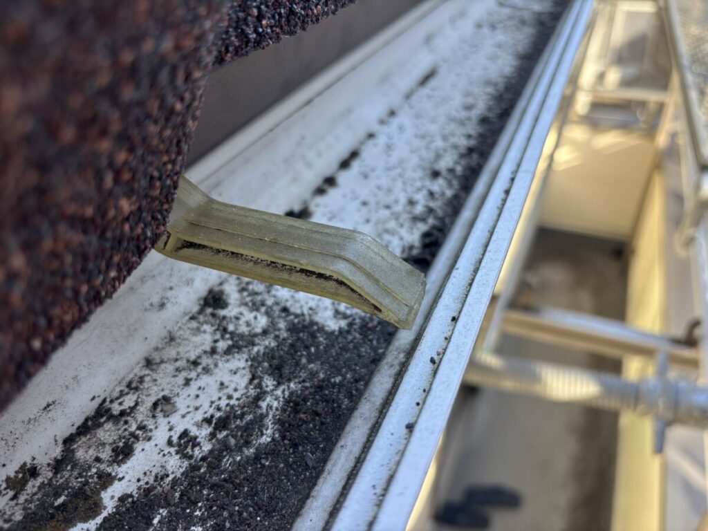 今回の現場で特に目立っていたのは、雨樋を固定しているプラスチック製の金具の破損です。雹の衝撃により複数箇所で割れや欠けが発生し、雨樋自体がしっかりと固定されていない状態でした。このような状態では雨水が正常に流れず、途中であふれて外壁や軒先に直接流れ落ちてしまいます。これを放置すると、外壁の汚れや劣化だけでなく、雨水が建物内部へ侵入しやすくなり、最終的には下地材の腐食やカビの発生といった深刻な被害につながる恐れがあります。