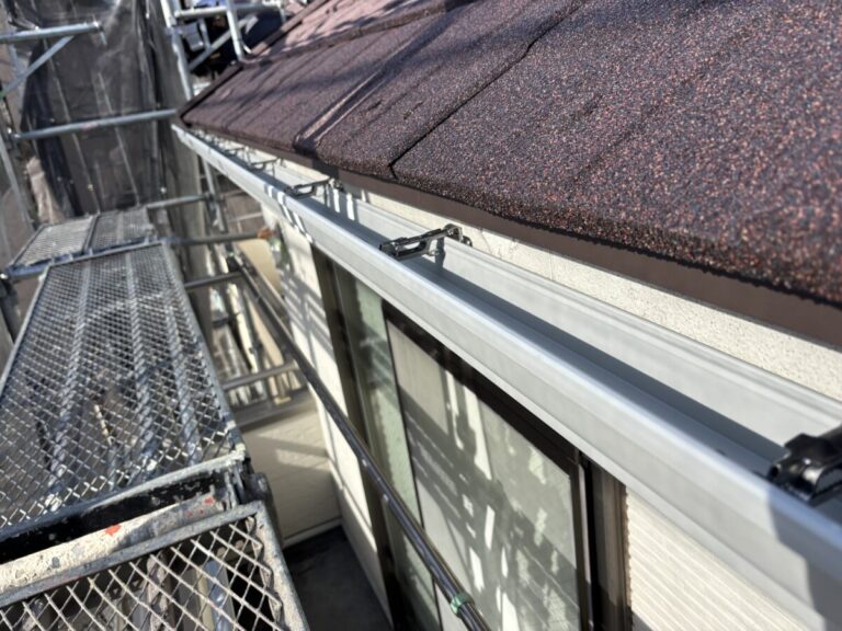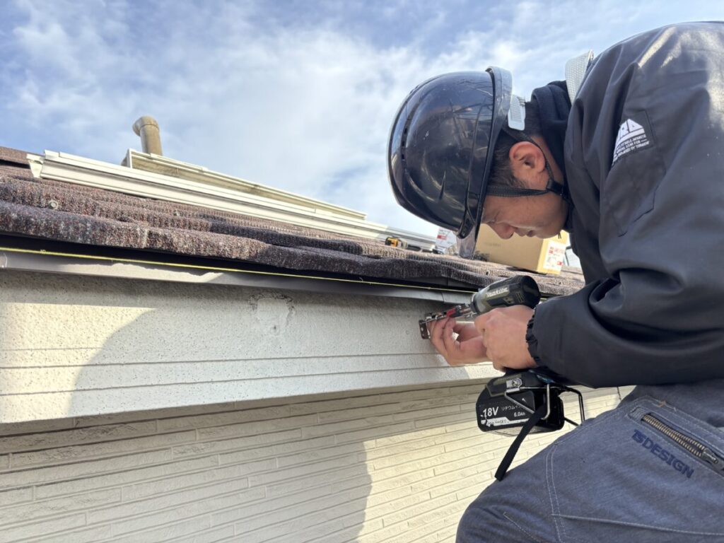 次に新しい雨樋の取り付けを行います。施工前の問題点を踏まえ、適切な位置と勾配を確保しながら設置することで、雨水がスムーズに流れる状態を作り上げます。施工中は金具の固定強度や接合部の密閉性にも注意を払い、再び雨漏りが起こらないよう細部まで丁寧に仕上げました。施工完了後は見た目もすっきりと整い、機能面でも安心できる状態になっています。もしこの工程を行わず放置していた場合、雨水被害がさらに広がっていた可能性が高い現場でした。