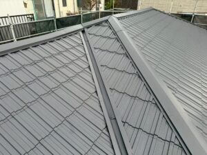 雨押えは端のセメント瓦の半分ほど被るくらいに加工をし軽く折り目をつけて取り付けることで水が壁際に行かない様にしました。