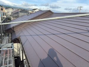 雨押えは端のセメント瓦の半分ほど被るくらいに加工をし軽く折り目をつけて取り付けることで水が壁際に行かない様にしました。